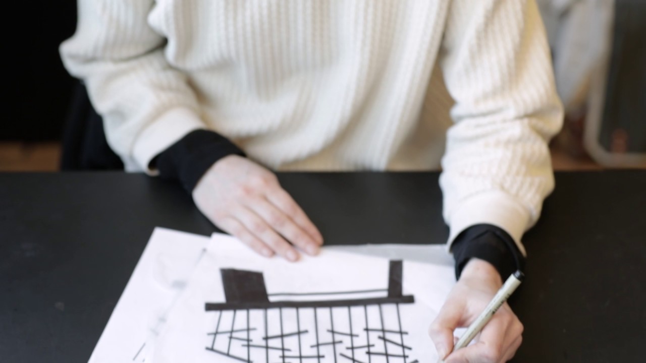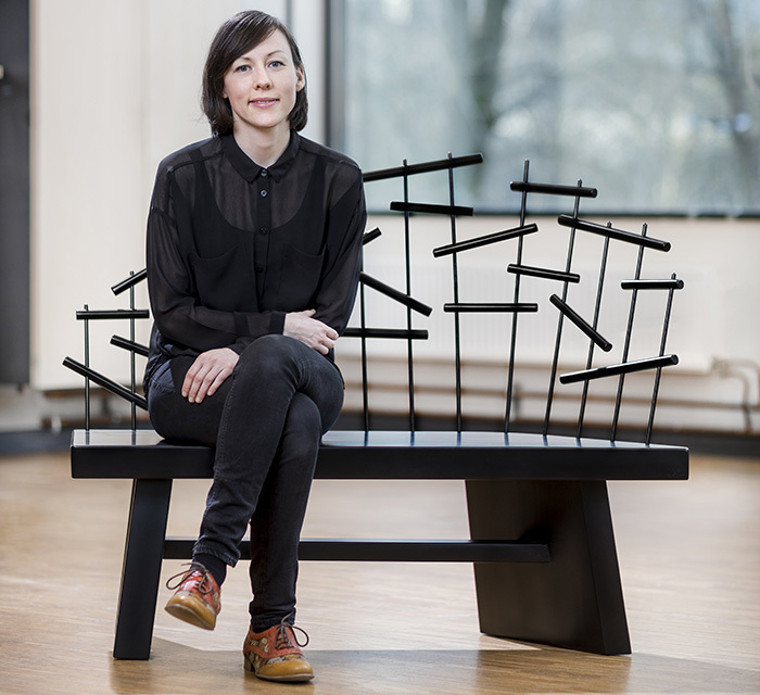 Fie’s entirely black furniture emerged from her simple two-dimensional sketches. The idea is that it should be transformative, like a shadow changing shape depending on where in the room one stands. The back’s floating spindles are inspired by the shape and movement of a mobile, firing the observer’s imagination.