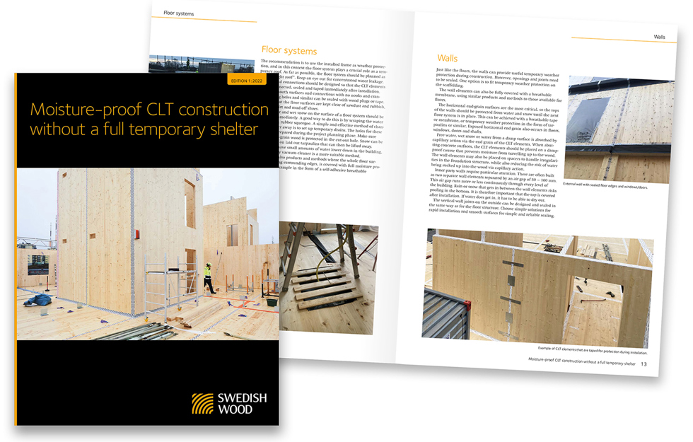 The publication Moisture-proof CLT construction without a full temporary shelter provides guidance on how to handle CLT elements when building without a full shelter. It is intended to help project planners and builders achieve an industrial and dampproof CLT build.