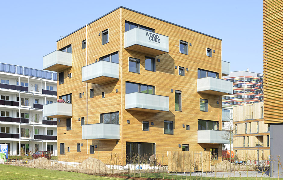 THE FIVE-STOREY WOODCUBE is part of the international building exhibition IBA 2013 in Hamburg. However, it by no means blends in with the crowd: the wood facade stands in sharp contrast to the white rendered concept houses opposite. The building is, as the name suggests, a cube in wood with wide balconies that protrude asymmetrically from the walls. It may not be the only building in the exhibition with a wood facade, but it is certainly the only one whose walls are entirely made from timber.