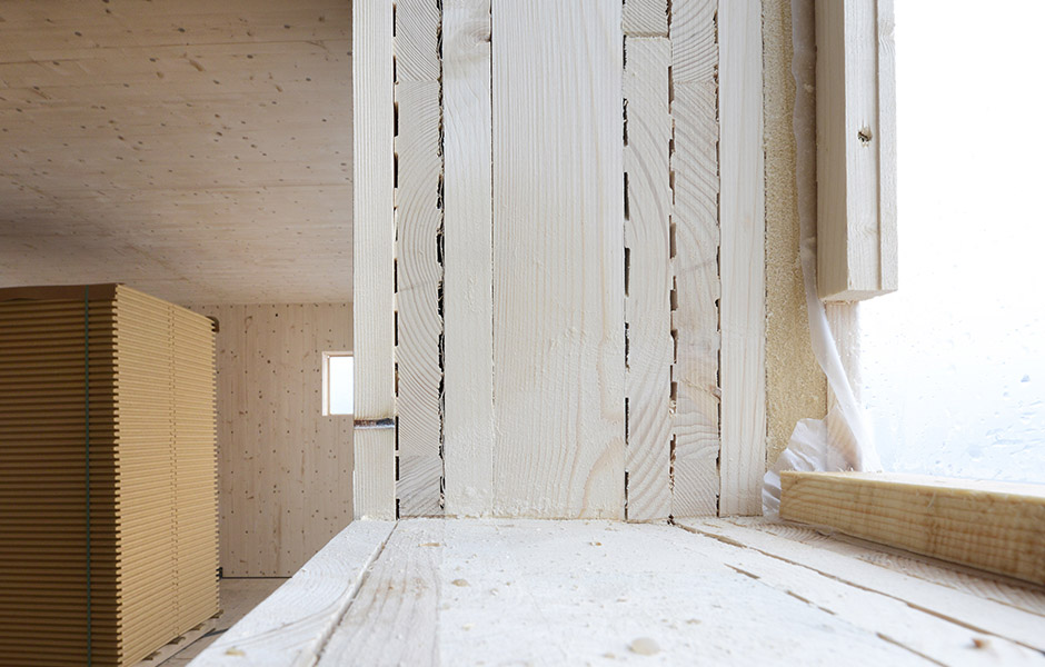 The design is an evolution of the Holz100 concept, a technology developed by Austrian Erwin Thoma. It is all so simple, with 20 plugs per square metre holding together all the layers of wood in an entirely natural way.