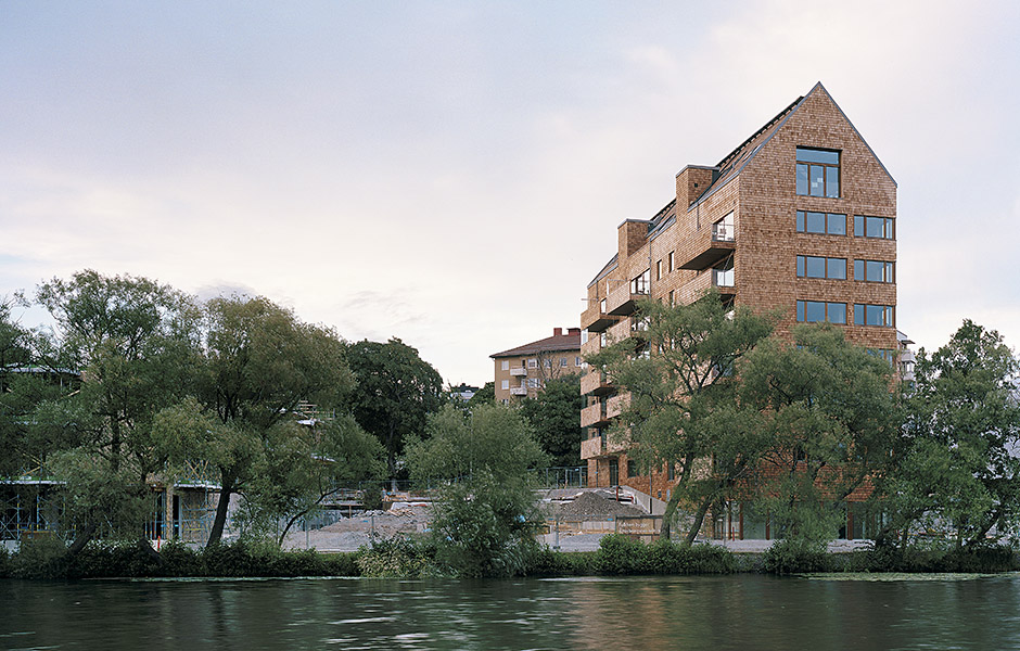 On closer inspection, the precision is impressive. Row after row of neat shingles wrap around the building. They line up with the windows, come out onto the balcony parapets and reach over the pitched roof, and in the corners they meet like the fingers on a pair of clasped hands – which is exactly as it should be. Developer Folkhem has always had high environmental ambitions for the project.