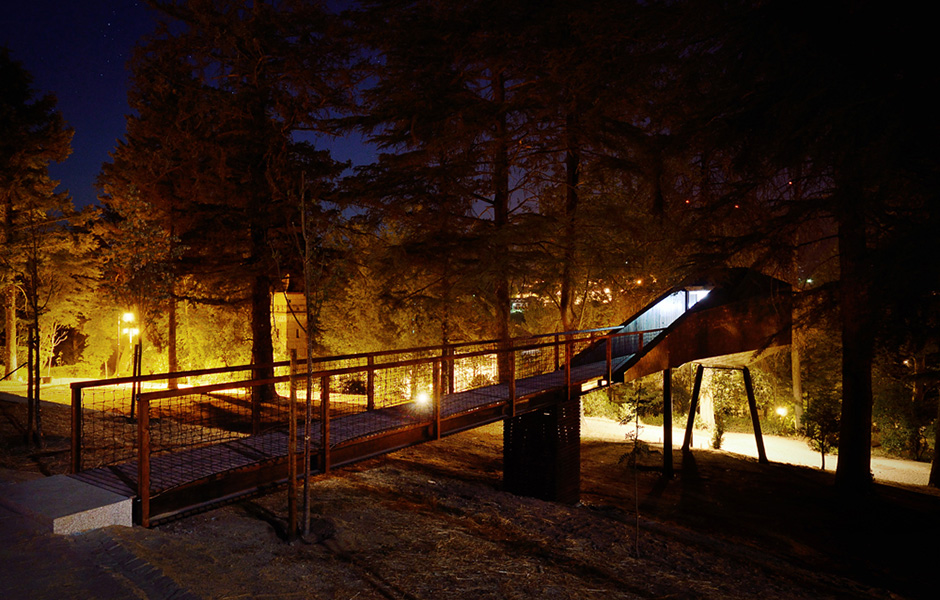 LONG AND NARROW, they stretch between the trees in the holiday resort of Pedras Salgadas in northern Portugal. These wooden snakes are actually accommodation. According to the architects at the firm Rebelo de Andrade, the purpose of the design and its location among the tree branches, is to fire up the imagination of visitors. The wooden cabins float above the ground, but instead of getting guests to climb up to them, they are led gently upwards along a narrow bridge, with the ground slowly falling away beneath them. Slender posts anchor the structure to the ground.