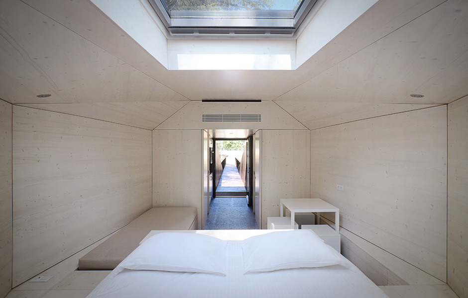 Inside, the cabins offer a combined living room and bedroom, with a kitchen and shower room on one side and a toilet and wardrobe on the other. Sustainable technologies such as solar panels and water recovery aim to make the buildings self-sufficient. Low-energy lights and well insulated walls ensure that use of electricity and heating is as efficient as possible. «