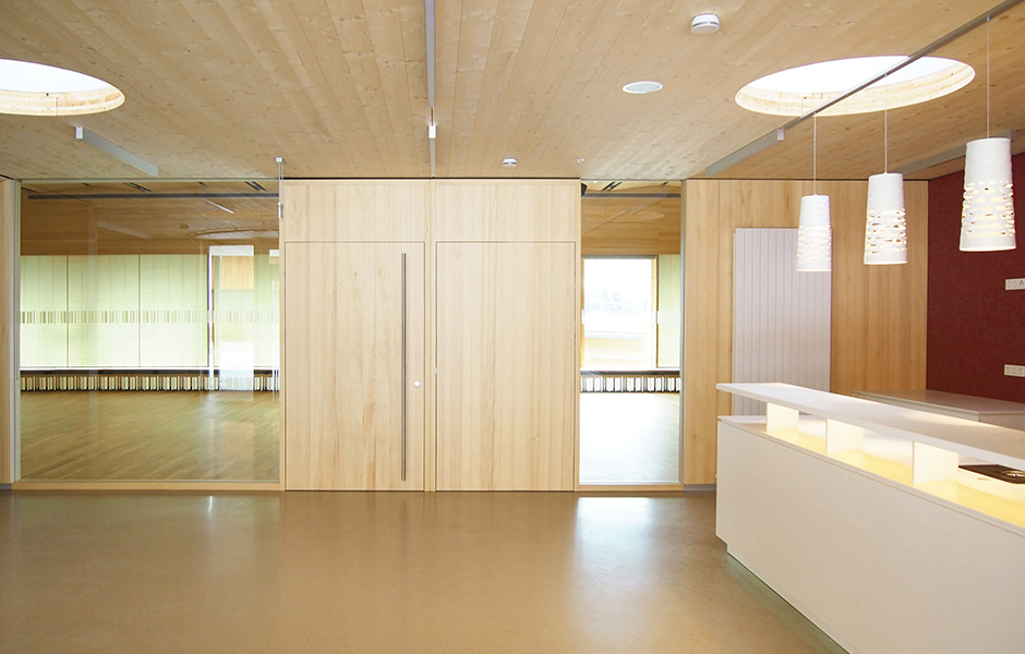 The top floor of the fire station is a popular clubhouse built in cross laminated timber. The fire station proper and vehicle bays are made from reinforced concrete. The interiors on both the ground floor and upper floor have walls, ceilings and floors lined with silver spruce to give a spacious uniformity. The exterior is also clad in spruce panelling. Maintenance-free zinc has been fitted just to a few exposed sections of the roof.«