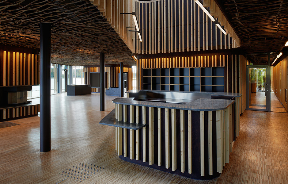 THE BUILDING IS SITUATED right by Lake Vänern, between an artificial carp pond and the landscape’s characteristic rolling hills. This location is due to the project being considerably delayed following the architectural competition that White won in 2008. White’s original design called Tallspråk was a low building wedged poetically between the pines of the forest slightly inland. In the design, the visitor centre had a distinctive floor and equally distinctive roof, with large round holes in them. The holes were intended for the pines that the visitor centre would have been built around.