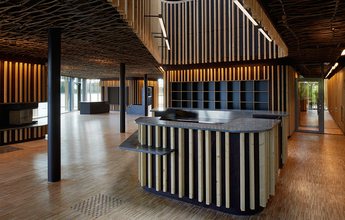 Acoustically, wooden laths of different depths and internal walls with rounded corners are perfect. They break up the sound and create a muted acoustic environment, which is important with an exhibition space and restaurant sharing the same area.