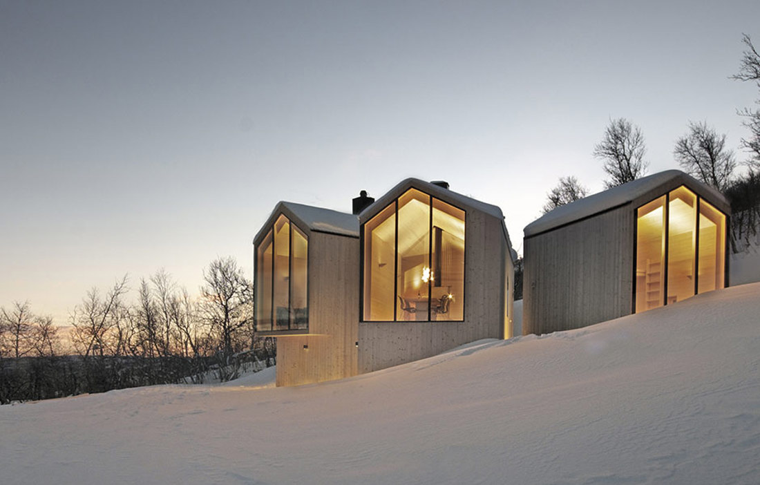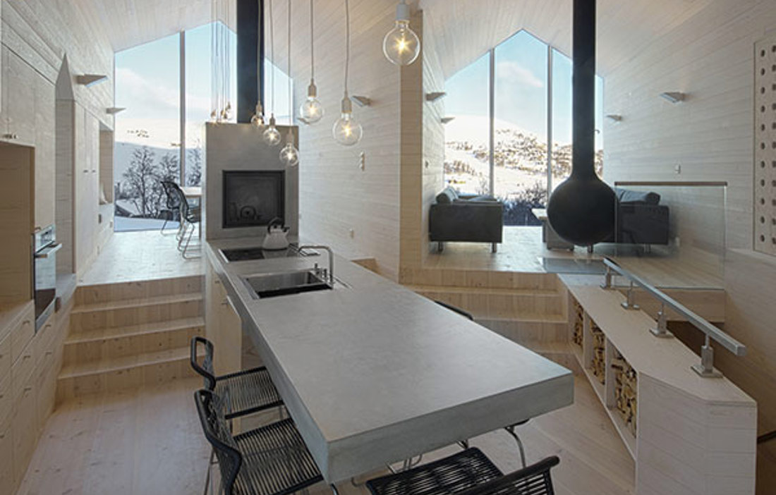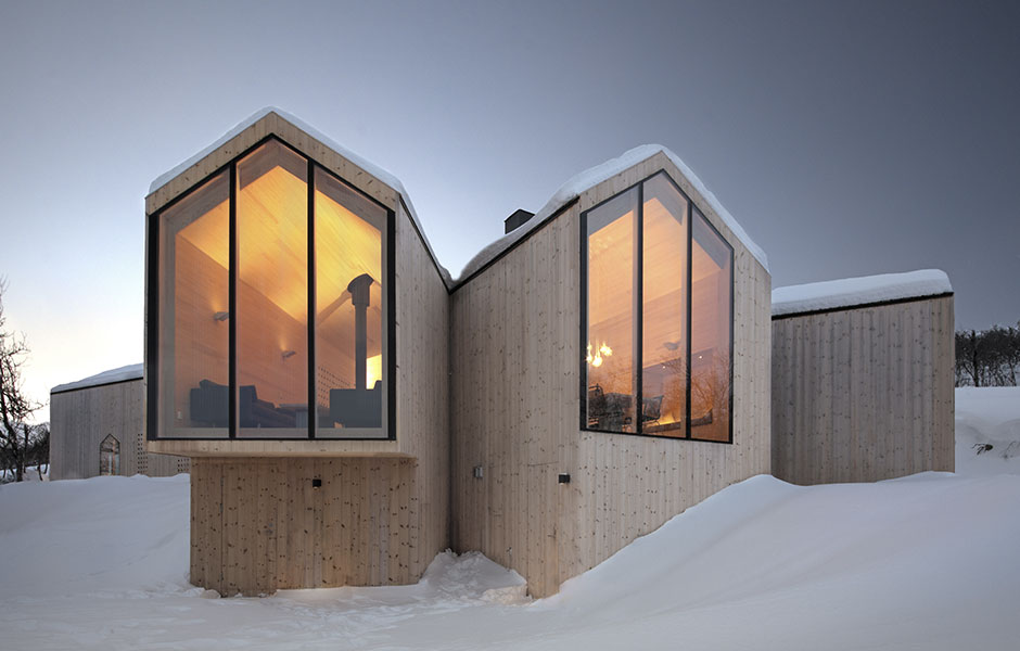 SPLIT VIEW MOUNTAIN Lodge nestles in the rolling hills near the village of Geilo, a popular ski resort in Hallingdalen, Norway. The chalet was designed by Oslo-based Reiulf Ramstad Arkitekter to meet the needs of a family with young children. The four sections of the house span different levels to follow the contours of the slope. From above, it looks like a foot with three spread toes.