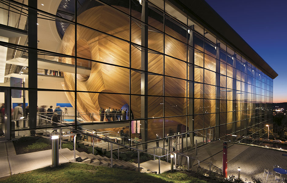 The shape is reminiscent of a ship. The outer hull is made of glass, while the inner section, which appears to float in its own universe inside the glass hull, is constructed in cedar boarding. Bridges lead from the foyer into the concert hall itself, which seats 1,200 people.«