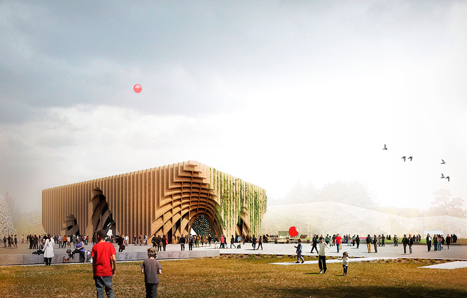 HOW CAN WE supply the world’s population with healthy food, today and tomorrow? France will be attempting to answer this pressing question at the world exhibition Expo Milano 2015. Drawing inspiration from the food markets that abound in French towns and cities, Paris-based XTU Architects are presenting a plant-covered wooden pavilion – a 3,592 square metre marketplace designed to be disassembled and reused after Milan. The load-bearing structure plus the facades, walls and floors will be made entirely from wood.