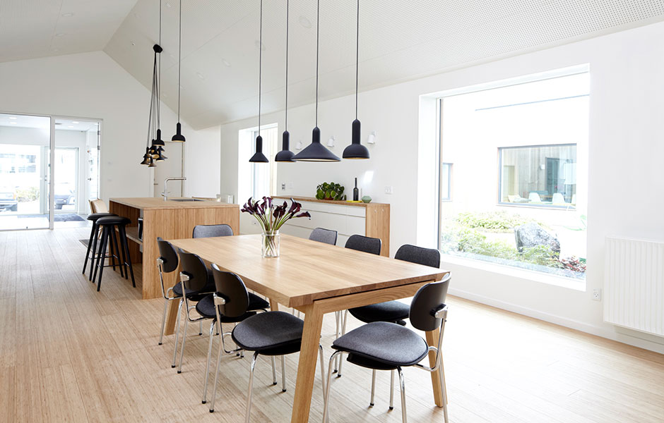 Many of the fixtures and fittings in Livsrum are also bamboo, with the proud Danish furniture tradition embodied in the tables, chairs and kitchen fittings. An entire wall in the main room is also lined with built-in bamboo shelving. Coming in through Livsrum’s main entrance, visitors are greeted by a large and beautiful oak dining table.