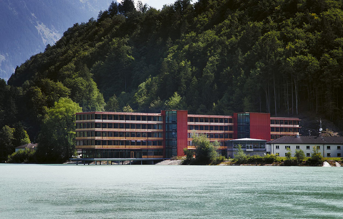 The building, which projects 120 m out into an artificial lake, has five storeys and was put up in just six and a half weeks. It is a simple and distinct building in both form and scale, reminiscent of a fine piece of furniture rather than a modern office building for a power company. The quality and attention to detail are breathtaking. The facades are untreated wood, since Kaufmann opposes all forms of fireproofing treatment. He argues that untreated wood can be recycled at the end of its life cycle and also ages beautifully.