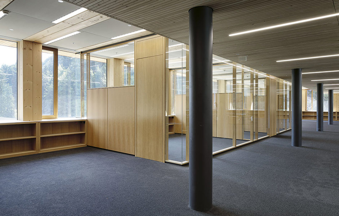 The characteristic horizontal projections along the facades have practical benefits such as making window cleaning easier, protecting against sunlight and improving fire safety. However, the design is primarily an architectural choice. Instead of using local spruce, as Kaufmann normally would, more exclusive oak has been used for the windows, panelling and flooring. The oak comes from Austria and from southern Germany. The business conducted in the building takes place in an open-plan office layout, something that remains uncommon in Austria, but was chosen consciously here to create a light and modern workplace.