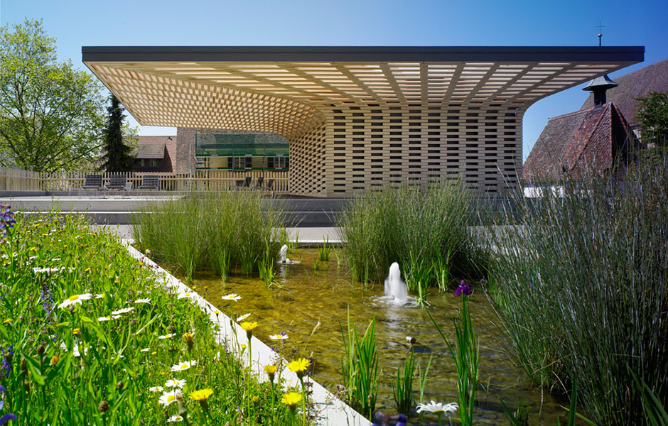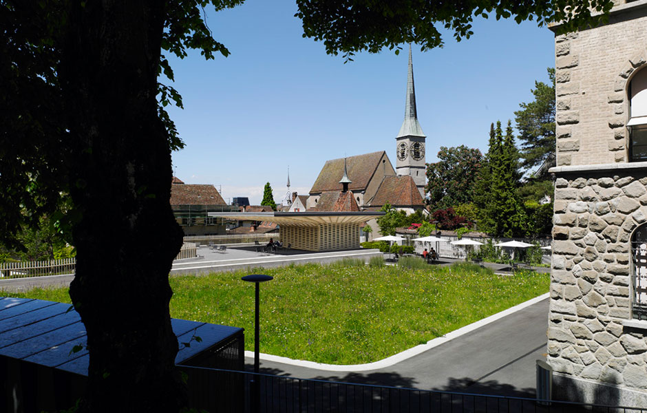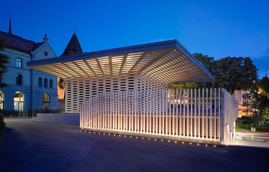 The car park's ventilation unit and lift shaft, which protrude above ground, have been concealed within the wooden structure and a new pedestrian access has been incorporated into the outdoor space behind screens of timber ribs. The wood in the pavilion itself creates a brickwork effect and the gaps provide glimpses of the wooden structural frame beyond. Swiss landscape architects Planetage worked with Ramser Schmid Architekten to design the new area. Also visit planetage.ch.«