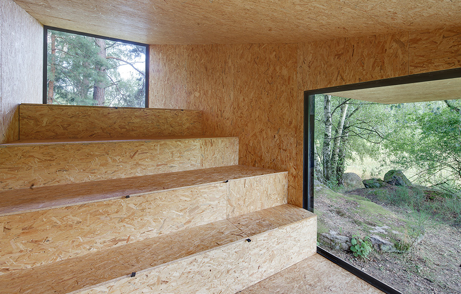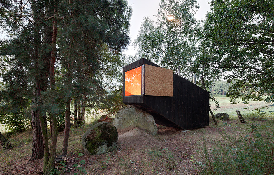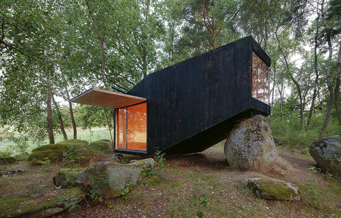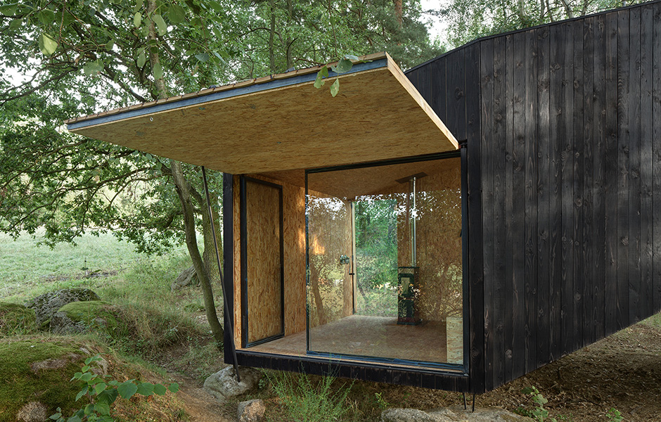 The little cabin, which measures 3.1 x 5.8 metres, leans jauntily against a stone boulder and has large glazed windows that can be shuttered over. All the exterior cladding is made from charred wood – and all the wood is sourced from fallen trees in the nearby forest.«