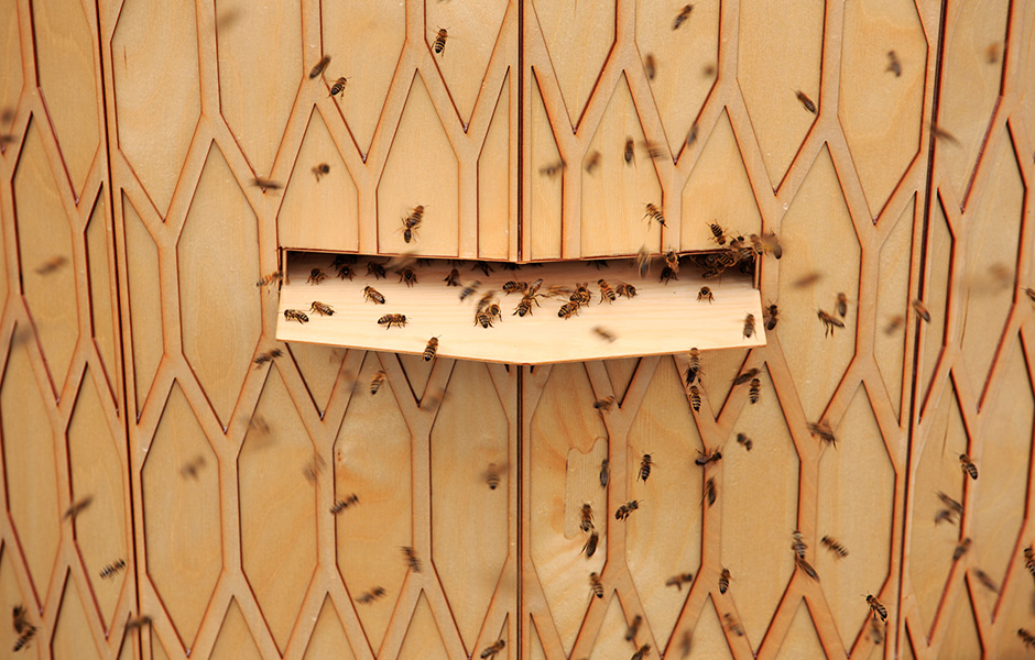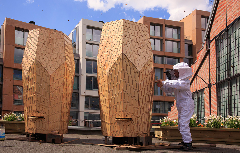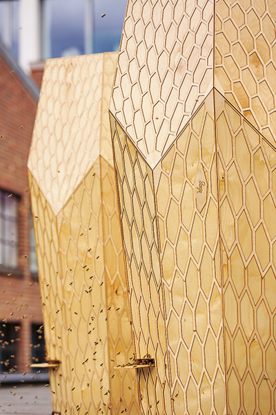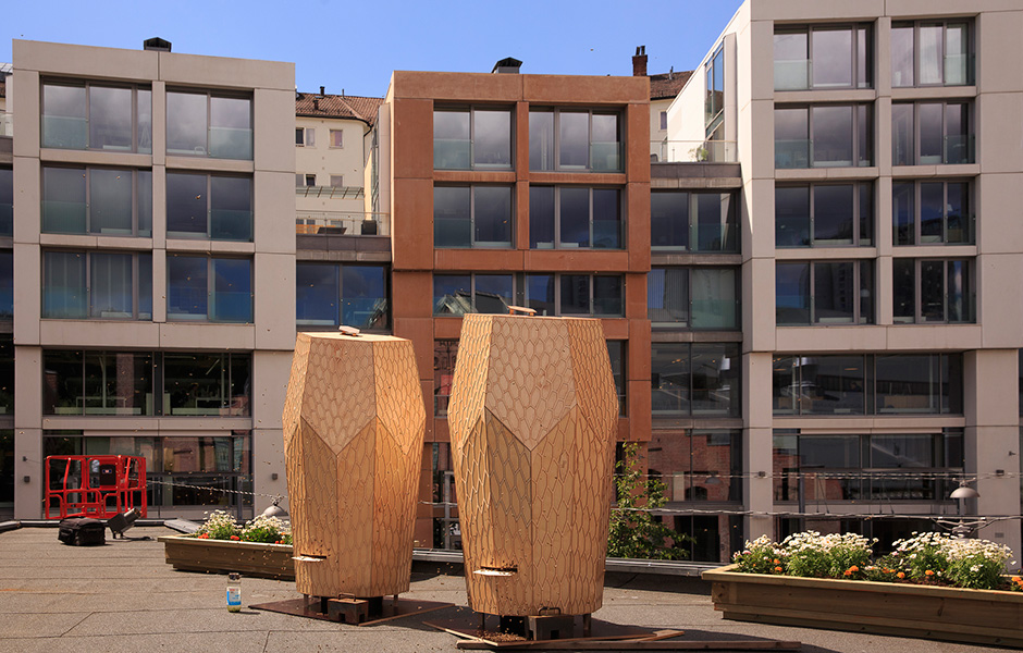 BEEKEEPING IN THE middle of the city might sound odd, but it is happening in Oslo, where the architectural practice Snøhetta has designed a honeycomb-shaped beehive that follows the example of nature. The structure is high up on the roof next to a large food hall in Oslo, close to the hall’s restaurants and various parks in the Norwegian capital, where the bees can find pollen and water.