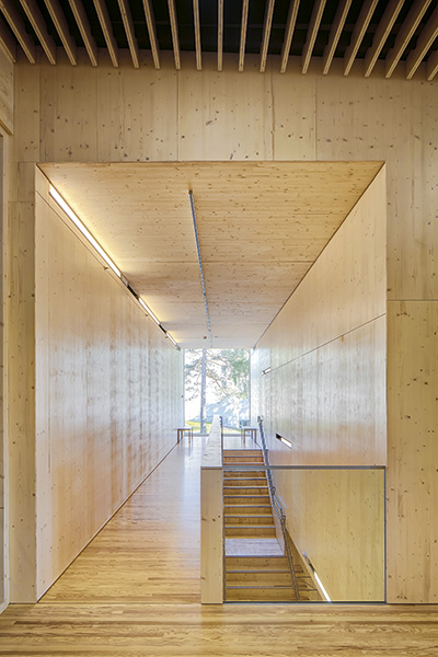 APART FROM THE ground floor, where some concrete had to be used, Haltia is a building made entirely from wood. The whole visitor centre is constructed using prefabricated cross laminated timber (CLT) in spruce that was manufactured in Austria. The strength of the material means that there is no need for structural posts or beams. The panels were delivered in 4 x 16 metre pieces of varying thicknesses, which were then customised by a Finnish company in Pälkäne before being shipped to the site. The building is the first in Finland to use this type of CLT throughout – from the structure to the facades, to the ceilings and floors. Haltia’s inspiring use of wood helped it to win last year’s Finnish Wood Prize. However, using wood to this extent has not been possible in Finland until very recently.