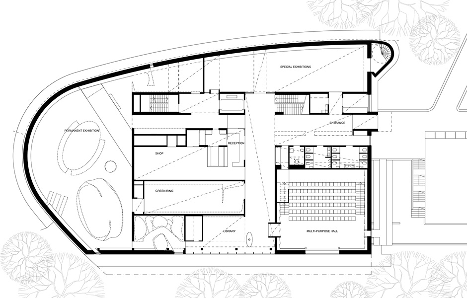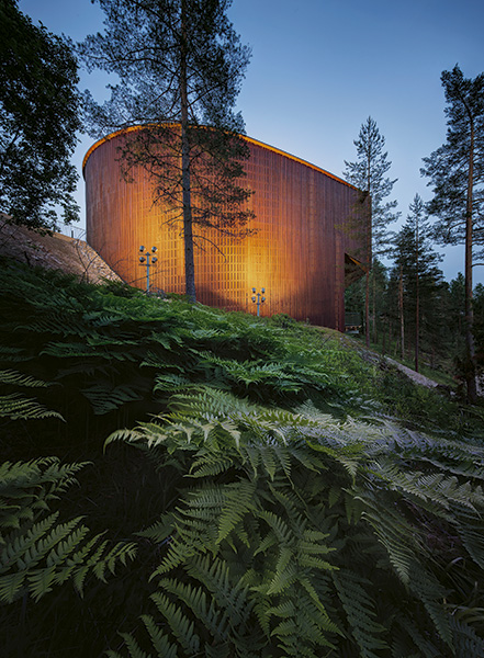 THE MAIN EXHIBITION at Haltia comprises nature films, photographs and an animated, soundtracked landscape panorama. The visitors also have an opportunity to experience a night walk in the Finnish wilderness, and visit a bear in its winter lair. As well as its exhibitions, the building has conference facilities, a restaurant, a café and an auditorium. Since Haltia sits on a 40-degree slope, the entrances to the different levels have been placed at different points on the hillside, creating separate entrances for each level. This also provides clever evacuation routes from the premises, which combine with a sprinkler system to meet the fire safety standards for a wooden building of this scale.