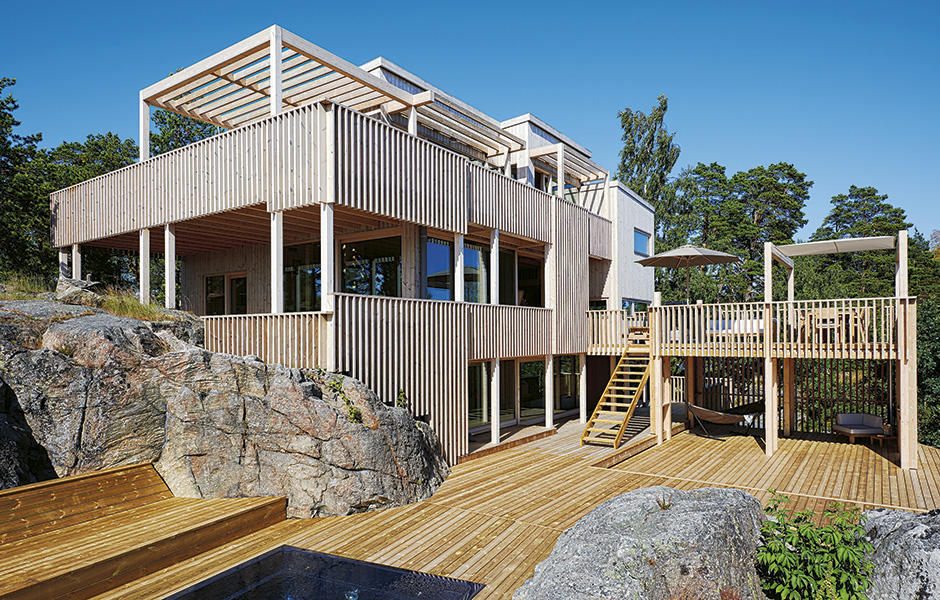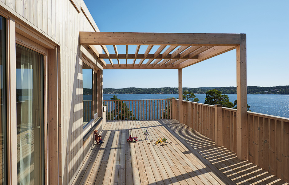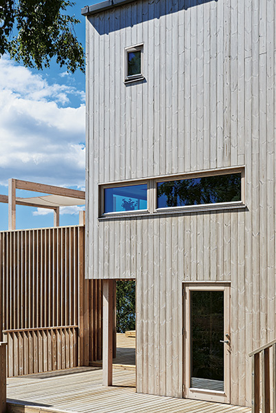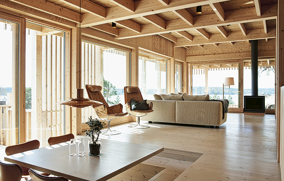 The Holm family wanted to build their house in Nordic wood. They chose spruce glulam, heat-treated pine for the facade and ceilings, pine plywood and solid pine flooring.