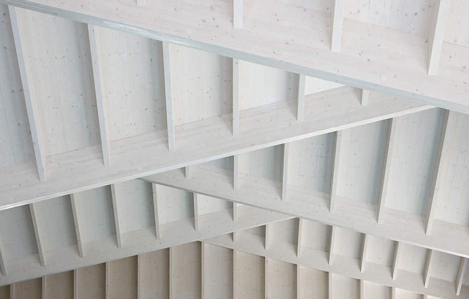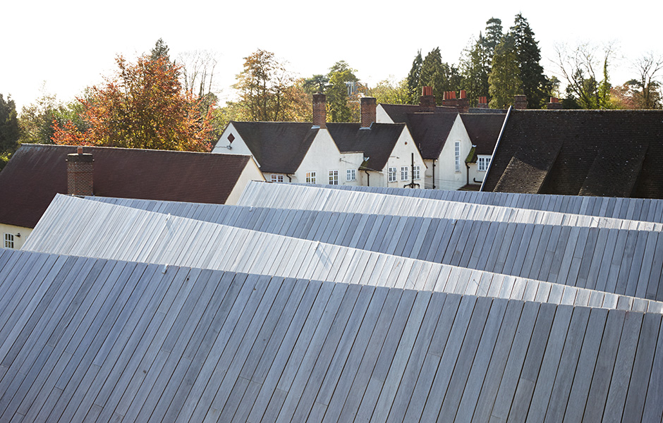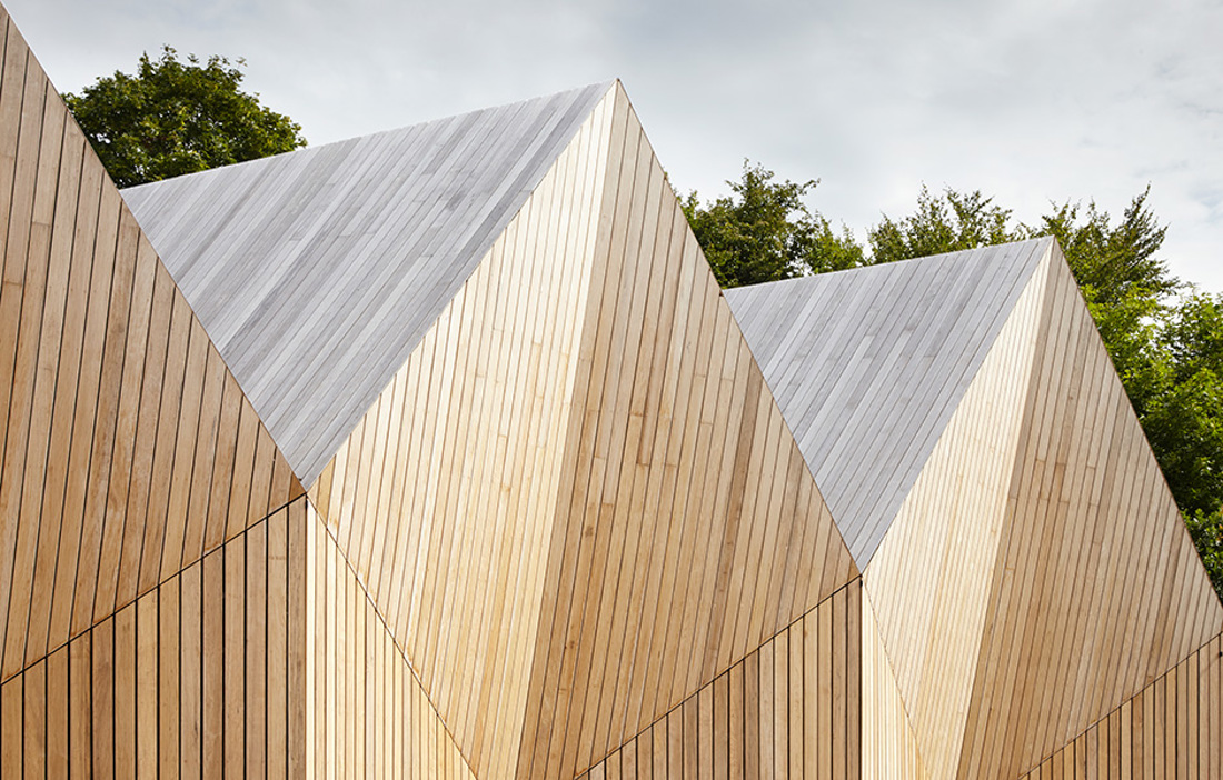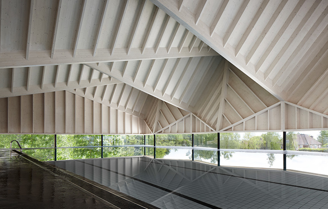 WHEN LONDON-BASED ARCHITECTS Duggan Morris were commissioned to create a pool building for Alfriston School in Buckinghamshire, southern England, the result was a geometrical dream in wood. The roof is a concertina-like glulam structure that, as well as being aesthetically stunning, also helps to dampen sound in the pool.