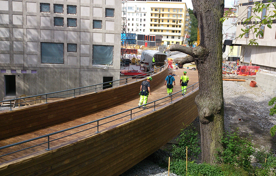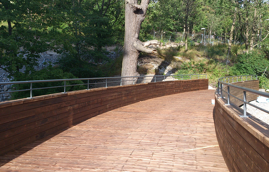With a good dose of innovative thinking, slim beams and double gluing, a curve was introduced to bypass the tree. The 30 metre bridge has been in place since June 2014. It comprises an architect-designed platform that in turn comprises eight blocks. Each block is made from 11 glulam beams in spruce, and each beam is 45 millimetres wide. The platform was designed by architect Gösta Olsson of the Stockholm City Development Administration. The cladding and deck are heartwood pine.