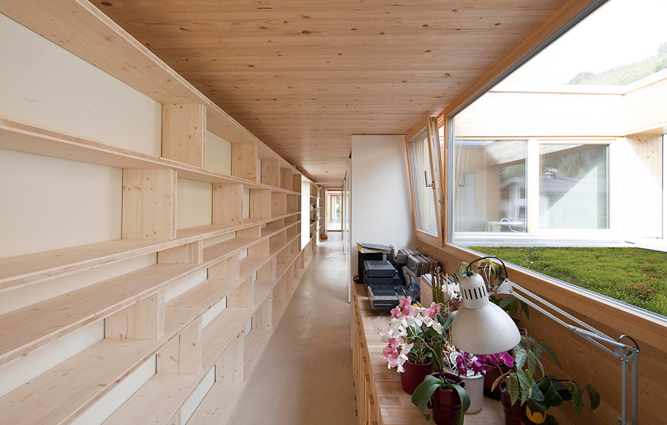 IN THE AUSTRIAN state of Vorarlberg, sandwiched between forest and coastal fields, a 285 square metre family home stretches 37 metres in length. The long shape of the house, with its structural frame and walls made entirely from spruce, has been determined by the peculiarly shape of the plot. The architects Juri Troy had the challenge of creating the best possible layout for the house, which has to serve not only as a home but as a workplace for a graphic designer.