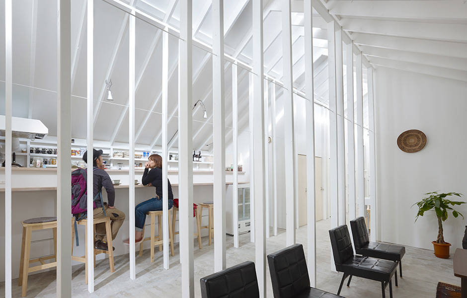 The guest house also features three double rooms with integral steps up to the sleeping loft. The structure comprises narrow wooden pillars and walls rising up to a roof that lets light flood in, in homage to traditional Japanese architecture.