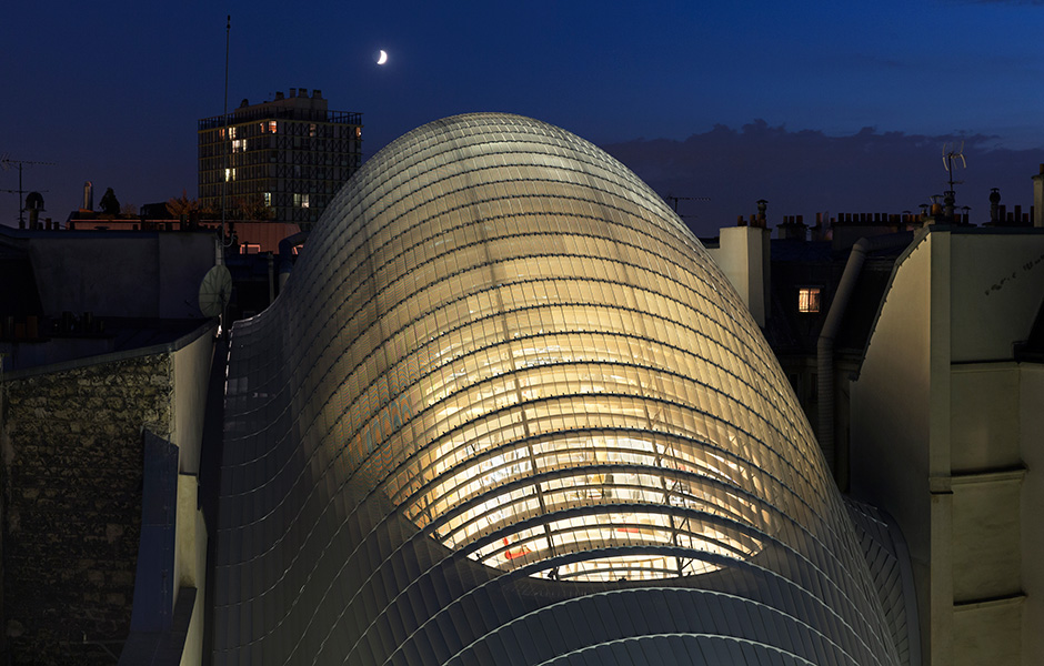 THERE IS AN art to getting a modern building to blend into a district from the mid-20th century. Italian architect Renzo Piano succeeded by creating a gigantic grey armadillo that binds together existing buildings on Avenue des Gobelins in central Paris. In the day, the round exterior goes almost unnoticed, but in the evening it lights up the whole district like a glowing orb.