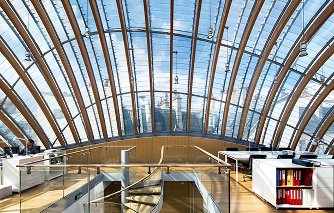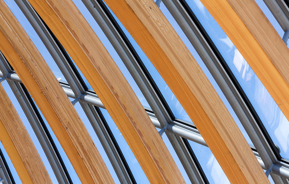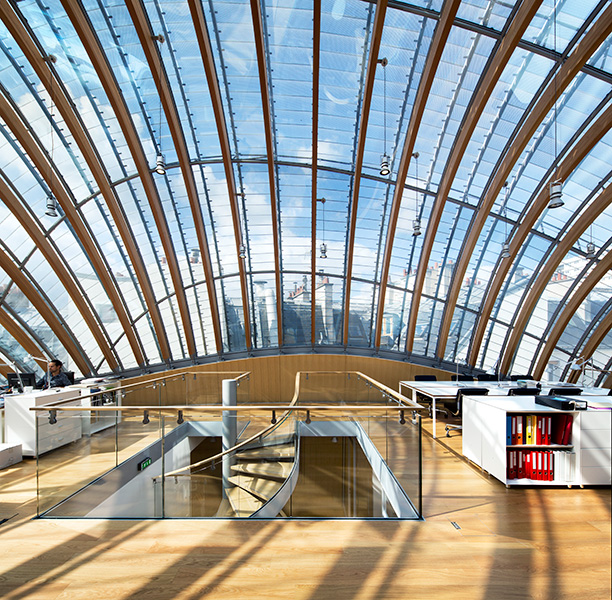 Moving into the modern building is the film foundation Fondation Jérôme Seydoux-Pathé, which will have offices, exhibition space, archives and a cinema here. The armadillo-shaped building, constructed around a frame of larch glulam arches, peeks inquisitively above the French capital’s jagged roofline. The domed roof, made of glass and glulam arches, brings natural light to every part of the 2,200 square metre building. The intention was to draw on the warm feel that larch provides, according to Thorsten Sahlmann, one of the architects.«