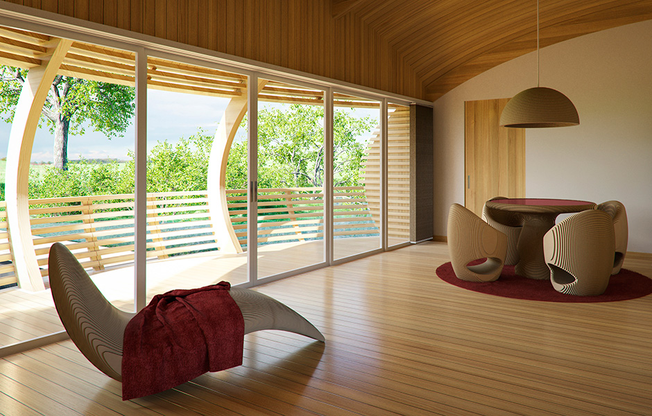 THE POLAR ICE is smelting. Sea levels are rising. But the ‘WaterNest 100’ simply floats above it. The droplet shaped floating home has a living area of 100 square metres and is made from laminated wooden ribs in a design that takes many of its cues from a boat hull. A thin frame sets the shape, which is then clad in horizontal strips to create a structure that is both light and strong. The building is kept afloat on a pontoon of sheet aluminium. Both the residence and the pontoon are intended to be made from recycled materials, with up to 98 percent of all the constituent components also being recyclable.