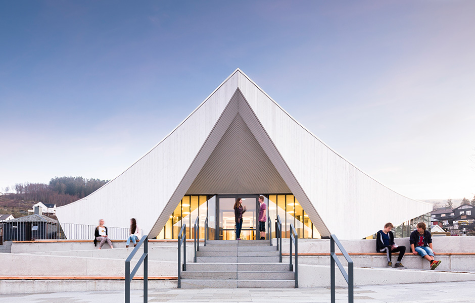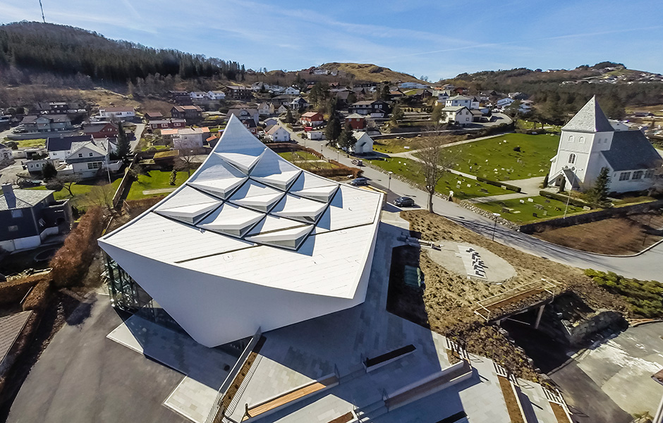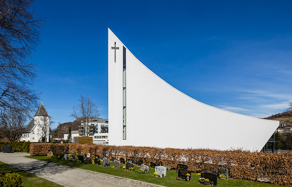 Now Ålgård and the magnificent landscape in south-west Norway once again have the eyes of the world on them. The newly built Ålgård Church is an architectural masterpiece that has become a beautifully low-key local landmark since it opened in spring 2015. From a distance, the church looks like an enormous tent, with the white walls and sloping roof giving the impression of a light, soft canvas raised up on posts. At one end of the church, the entrance and steps symbolically face towards the village. At the other end, the church sweeps up in a gentle curve towards the sky. In one dynamic movement, the church rises up out of the landscape, like a natural continuation of Ålgård’s hills and valleys. The architectural practice behind the project is Norway’s LINK Arkitektur.