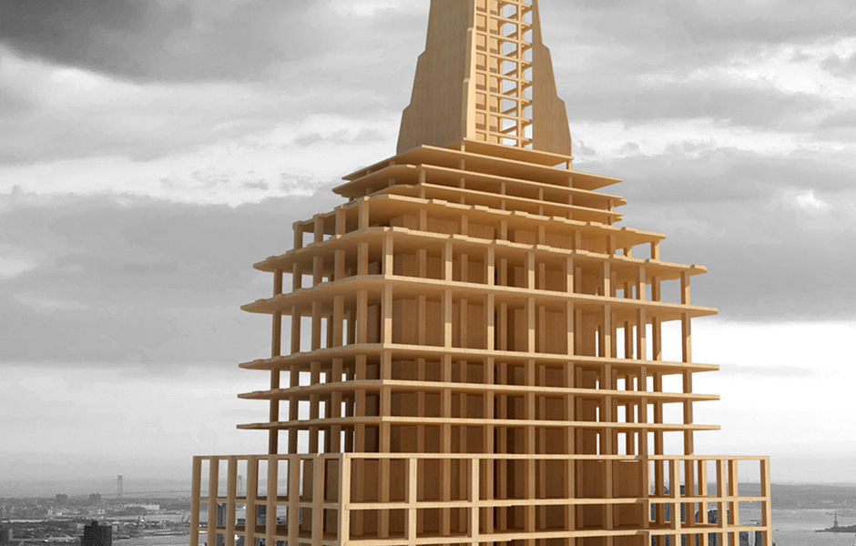 THE WORLD’S TALLEST tree is a sequoia, an American conifer that rises over 150 metres above the ground. That equates to around 30 storeys – or a third of the Empire State Building which, for forty years, was the tallest building in the world. Architect Michael Green is sticking his neck out with a proposal on how it would be technically possible to build a wooden copy of the Empire State Building. ‘Plan B’, as the project is called, is a collaboration with Finnish company Metsä Wood. They have developed a technique where thin strips can be glued together into panels of gigantic proportions. The wooden copy has basically the same structure as the original, with columns reaching over six floors. These are connected together using the glued panels, while steel wires add extra stability.