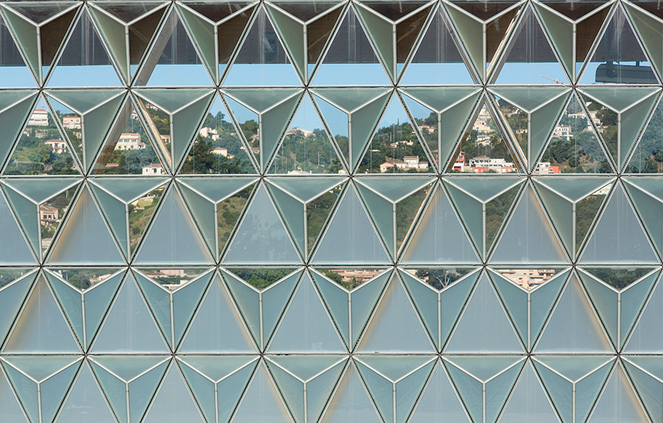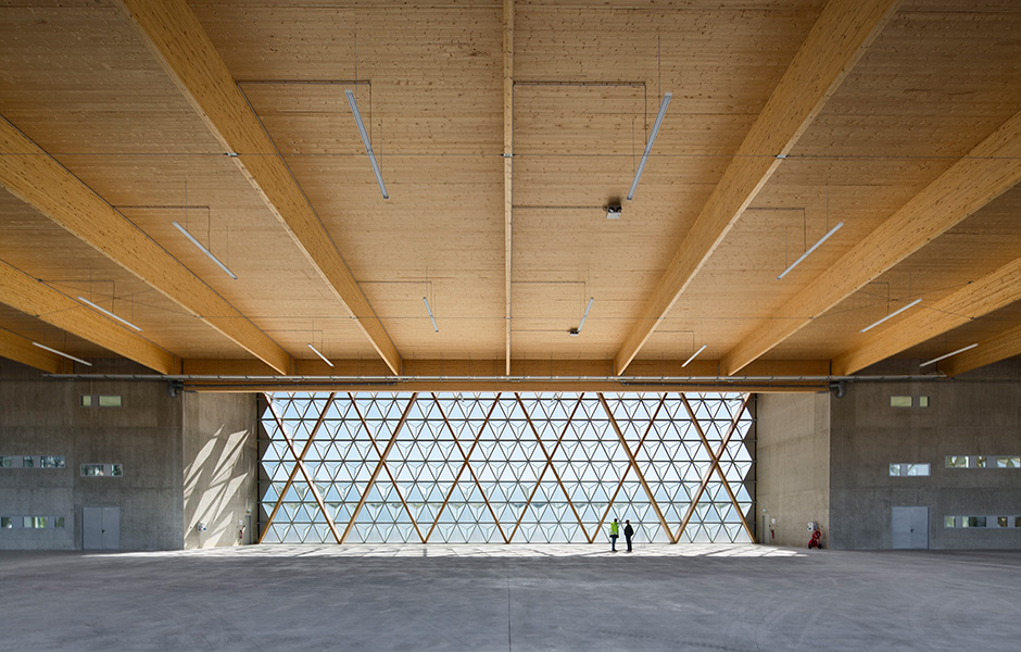 The hangar’s load-bearing frame is made from pine glulam beams. The height of the beams varies between 560 and 790 millimetres. The V-shaped diagonals create an attractive and flexible design. The façade is dominated by the triangular windows, which have flat glass mounted in parallel with three-dimensional, pyramid shaped panes. Between these sit narrow ribs of pine.«