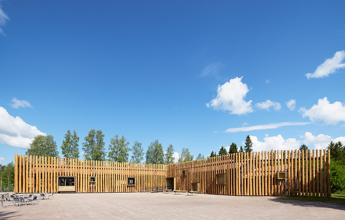 The new museum has a façade of charred boards enclosed by rough logs sourced from the nearby forest. The palisade-like structure is punctured by boxes that offer seating and let light flood in.«