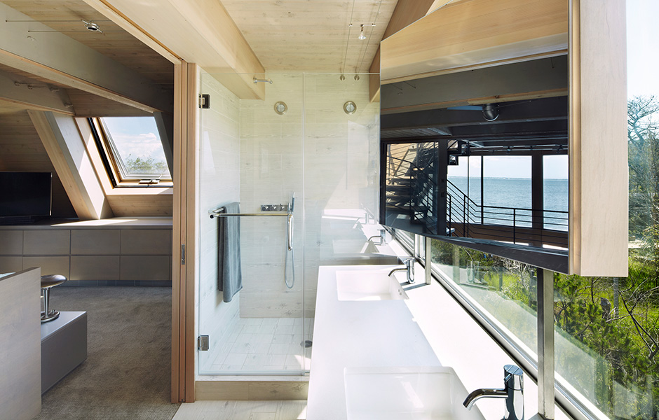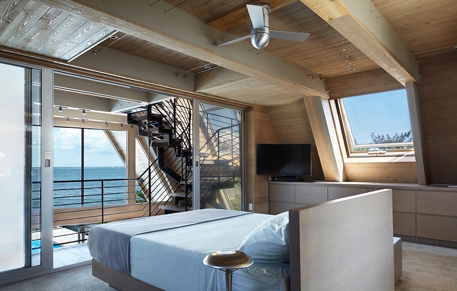The views now stretch for miles across the water from all three floors. The wood materials are exposed on the exterior and interior, and the whole building encompasses energy-friendly methods and technologies. The original steel staircase, which formed a huge presence in the middle of the house, has been replaced by a similar structure with wood as its dominant material. The staircase lines the walls of the home as it climbs up to the rooms in the roof apex.«
