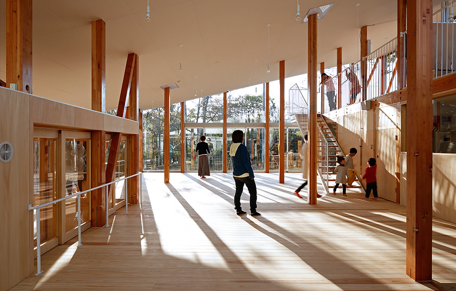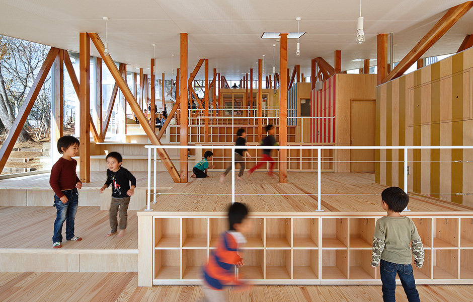 When the Yamazaki Kentaro Design Workshop was commissioned to design a nursery on the heavily sloping plot of 100 square metres, they wanted to bring the landscape into the building. The result was a terraced building with open spaces dominated by wood. The many angled pine beams give the interior the feel of a forest landscape, while also creating natural screens and allowing the space to be divided up for different activities, despite the open-plan layout.«