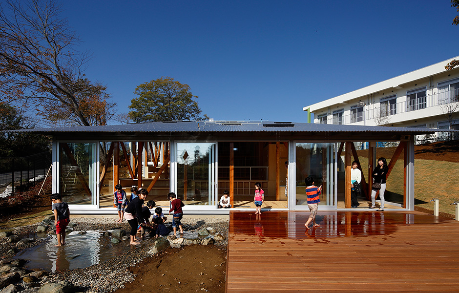 RAIN DOESN’T DAMPEN the children’s spirits at Hakusui Nursery School in Chiba, Japan. Instead they can rejoice as the water reservoir for the nursery’s own waterfall is topped up. Then it’s just a case of channelling the water in the guttering down into a pond that is perfect for splashing around in wellies. The waterfall also cools the sheet metal roof on hot days.