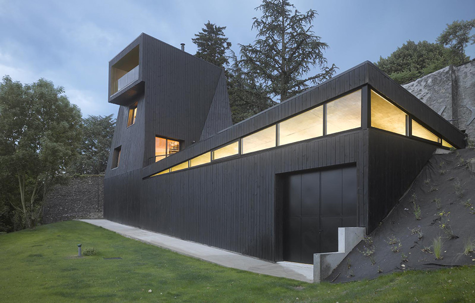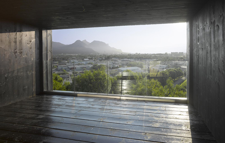 The timber frame is lined externally with vertical spruce cladding painted with asphalt. In the dark, with all the shutters closed, the building is transformed into a dark, irregular block that lives up to the architect’s description. Cross laminated timber (CLT) is used for the structural frame and some of the walls. On the inside, the unpainted panelling is combined in places with sheets of OSB. The tower rises up above the treetops to capture the views of the valley below, while the differently shaped windows provide a varied play of light.«