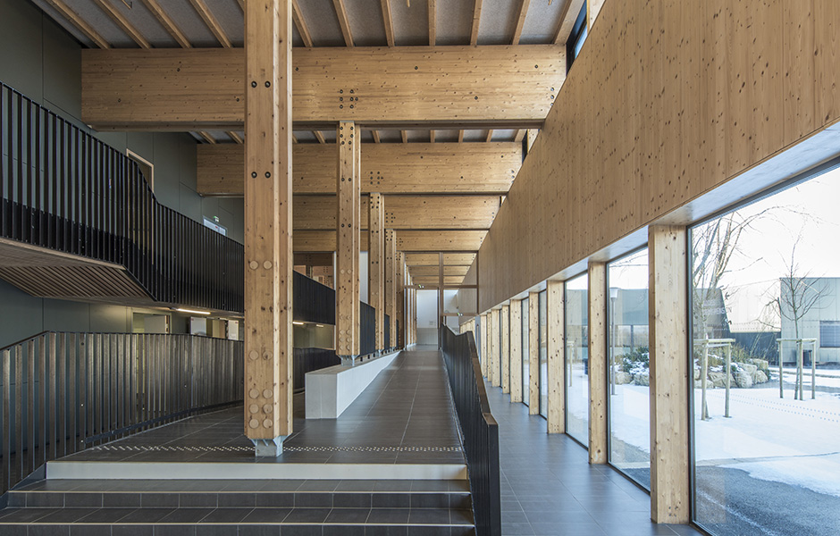 The architects resolved this by splitting the project into phases over a total of three years. The design has at its heart a few concrete walls, from which the solid post and beam structure in glulam radiates in all directions. The largest of the beams is 1.15 metres high.