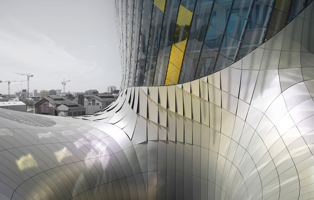 Internally, the wooden structure is clad in 4,000 square metres of plywood panels from the company Thebault. 3D modelling allowed the panels to be precisely cut and numbered in order to fit perfectly into the gigantic jigsaw that is the building envelope. 2,500 perforated aluminium sheets and 900 screenprinted sheets of glass have then been fixed over the top of the plywood panels. The undulating movement that begins down at river level concludes with a 55 metre high tower around which 128 glulam tendrils stretch up to the sky.