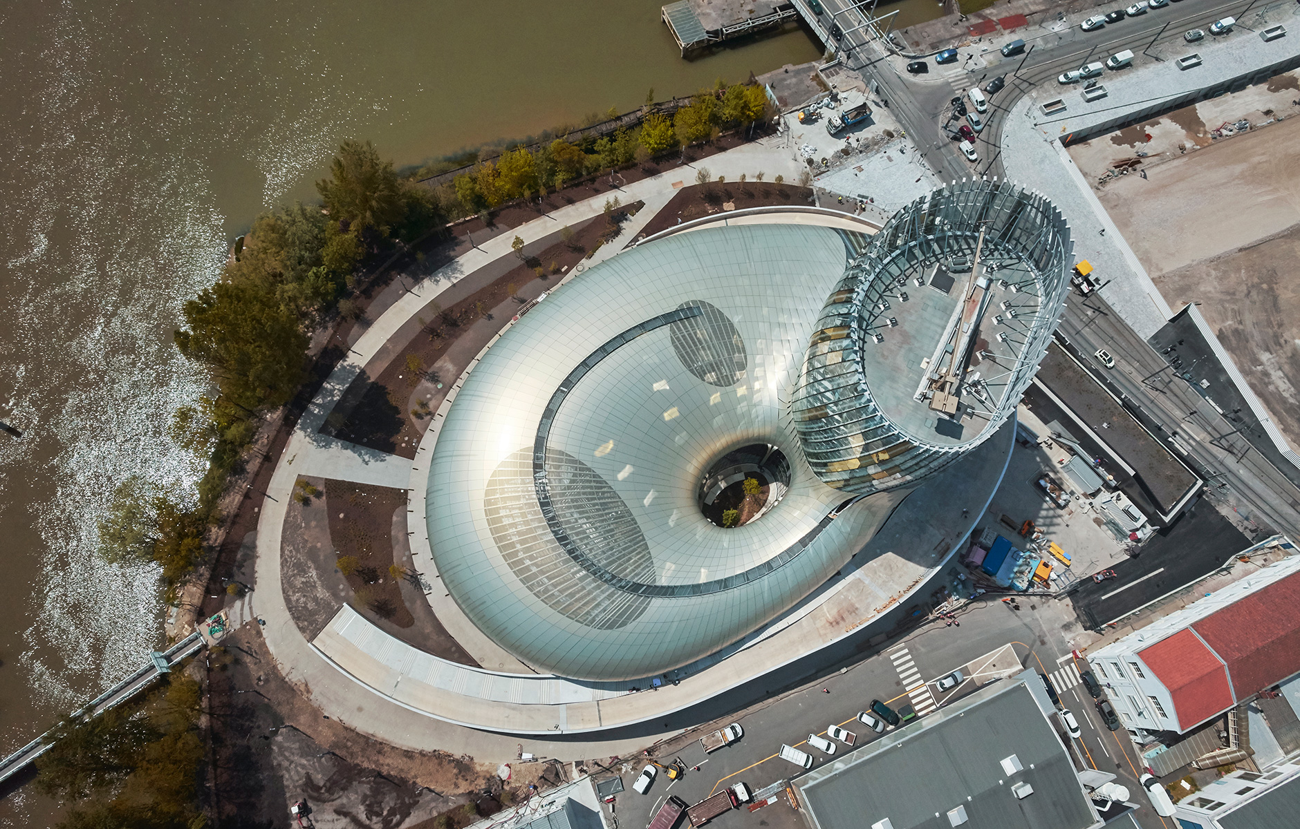 La Cité du Vin stands in a former port area adjacent to the River Garonne and close to the impressive bridge called Le Pont Bacalan Bastide. The initial construction work began in January 2014, when 300 piles were driven into the ground to a depth of 30 metres, anchoring the foundations in solid rock. The concrete carcass was then constructed and a few months later the external wooden structure was assembled around it using 574 glulam arches made from 1,200 cubic metres of Nordic pine and French Douglas fir.