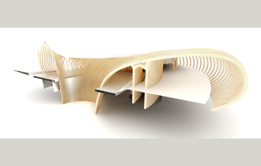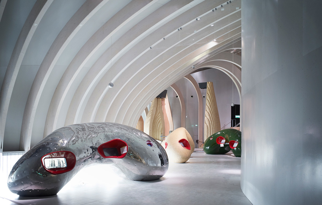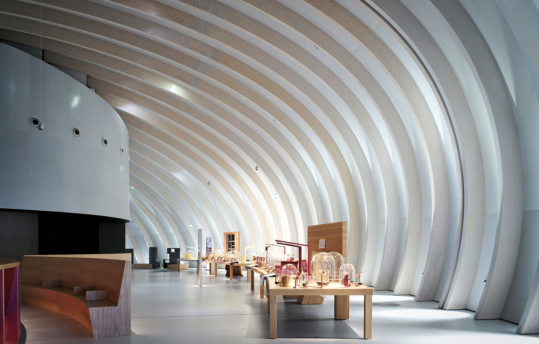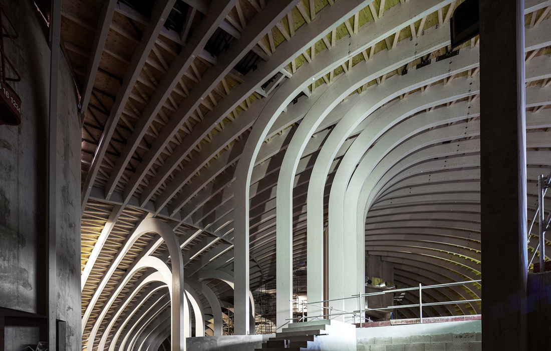 THE COMPANY RESPONSIBLE for the advanced wooden structure is Arbonis, which is part of the engineering consultancy firm Vinci. The structure is built from glulam that has been shaped into undulating arches using advanced CNC technology. These arches are inspired both by shipbuilding techniques and the anatomy of a boat, giving the building a look all of its own, both inside and out.