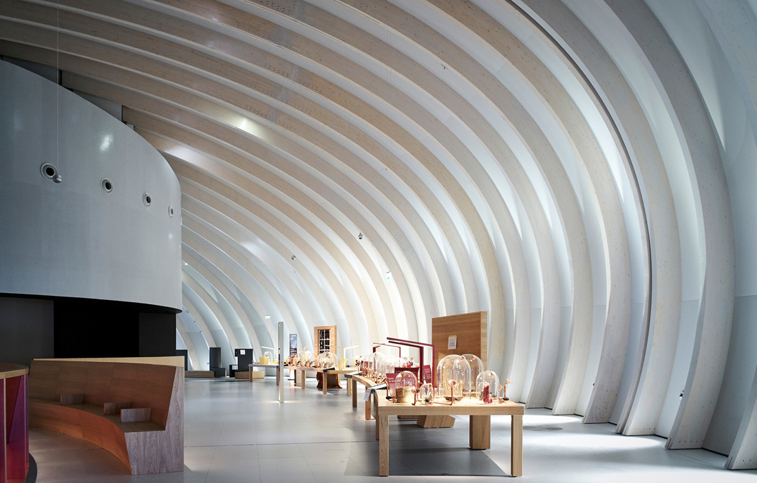 THE MATERIALS AND SCALE of the sensuously rounded shapes in the building’s exterior also carry over into the interior. As well as lending shadow and depth to the 3,000 square metre permanent exhibition on the museum’s third floor, the glulam arches also give momentum to the wave motion that leads the visitors both forwards and upwards in the building. With its absorbing and innovative staging, the permanent exhibition is the beating heart of the building. Here the wooden structure is covered with 200 square metres of fire retardant plywood. Thanks to the creative lighting, the ceiling conveys the feeling that visitors are standing beneath an open sky obscured by passing clouds. The symbolism and the links to wine production are clear, as the weather and the elements are often a critical factor that means the difference between a good year and a bad one.