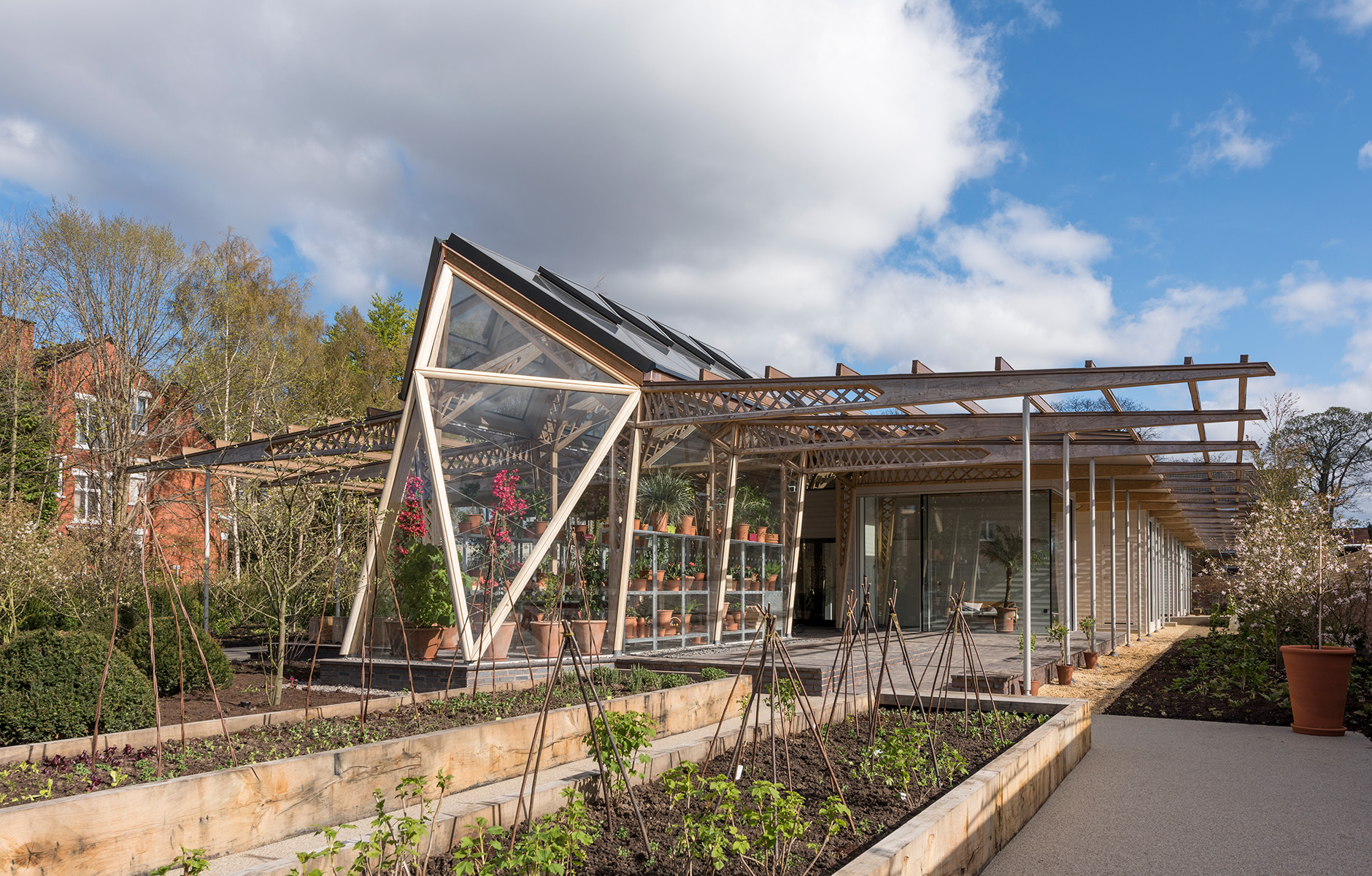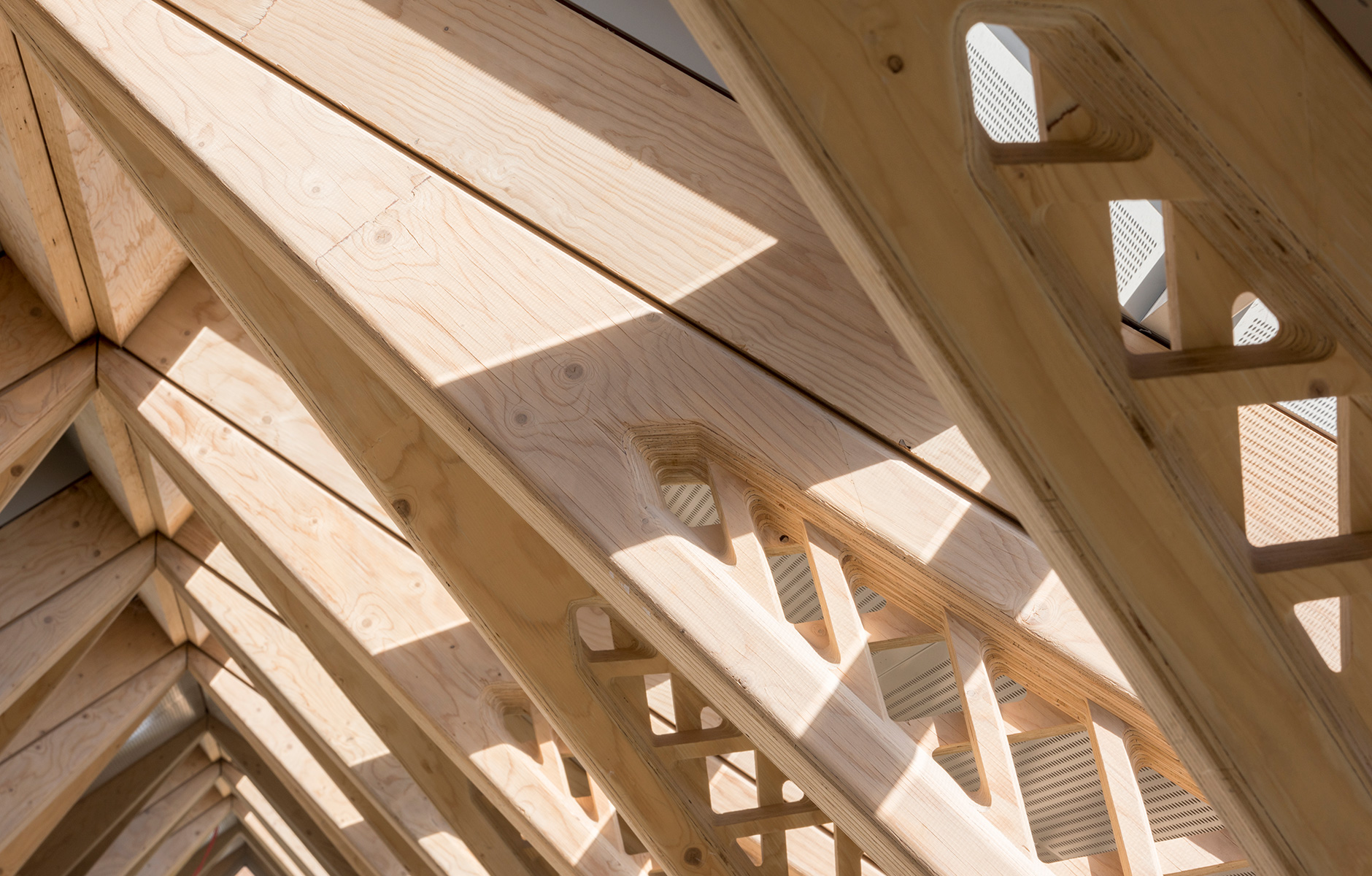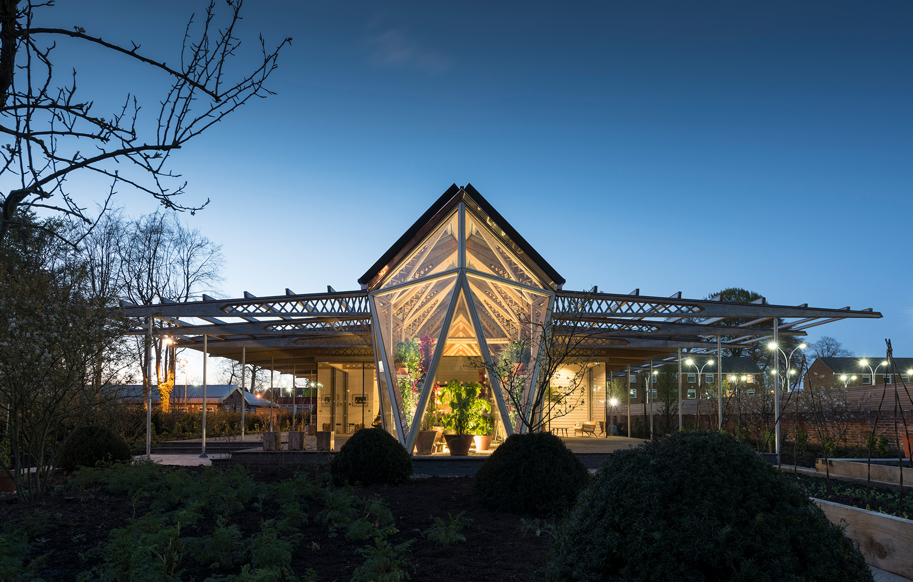MAGGIE’S CENTRE IS a British organisation that offers practical and emotional support for cancer patients and their relatives. The charity runs 18 centres across the UK, in pavilions attached to cancer clinics at various hospitals. The latest was designed by Norman Foster, who has first-hand experience of a cancer diagnosis. Located in his hometown of Manchester, the centre features large expanses of glass supported by an intricate network of wooden joists. These are made from simple Laminated Veneer Lumber (LVL). The laminates have spaces cut out so that together they form a kind of lattice, creating a structure that is both light and strong. Concealed bolts and steel fixings hold the nodes together.