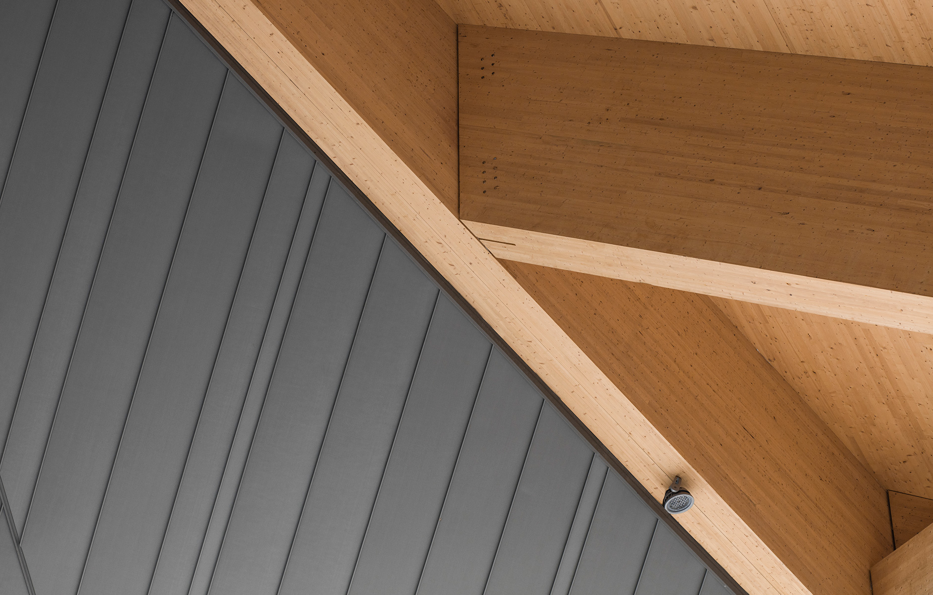 THE STRUCTURE GAINS ITS STRENGTH from two engineered wood products – glulam and crosslam. The top and bottom of the beams is made from glulam and the rest is crosslam. The result is a wooden structure that is relatively light, cost-effective and strong.