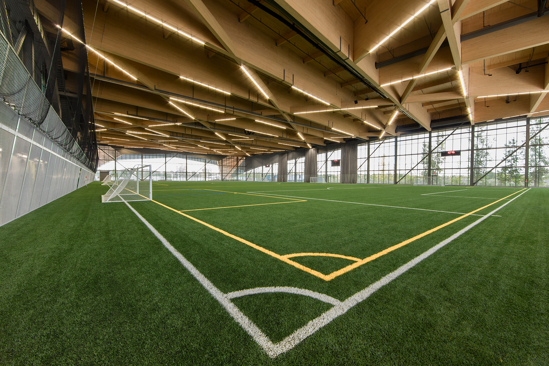 While the exterior is an expression of hard, dark minerals, the interior has a much softer feel. The football pitches are dominated by the gigantic wooden roof structure. The 13 main beams, which are 69 metres long and weigh 77 tonnes each, were developed in close collaboration with Nordic Structures. They were manufactured in Quebec and due to transport restrictions they were delivered in 23 metre lengths that were then rigidly joined together on site. The result is an impressive display of what wood can do.