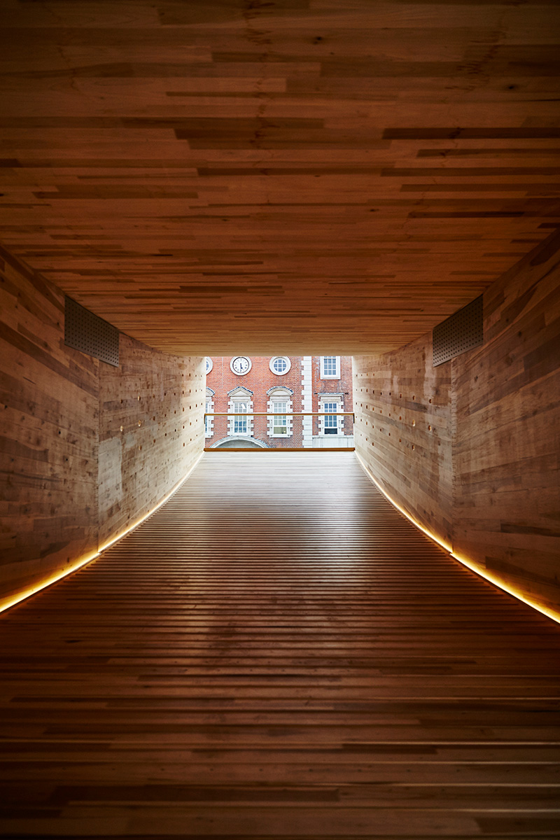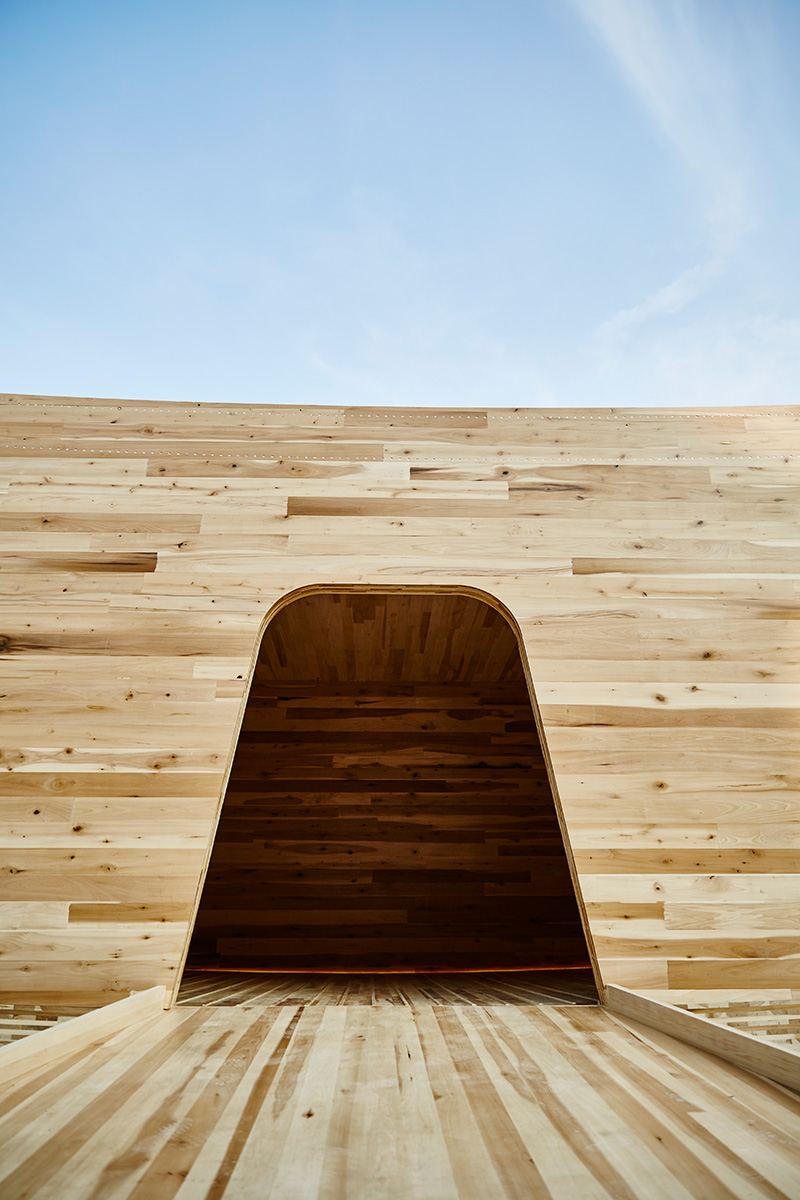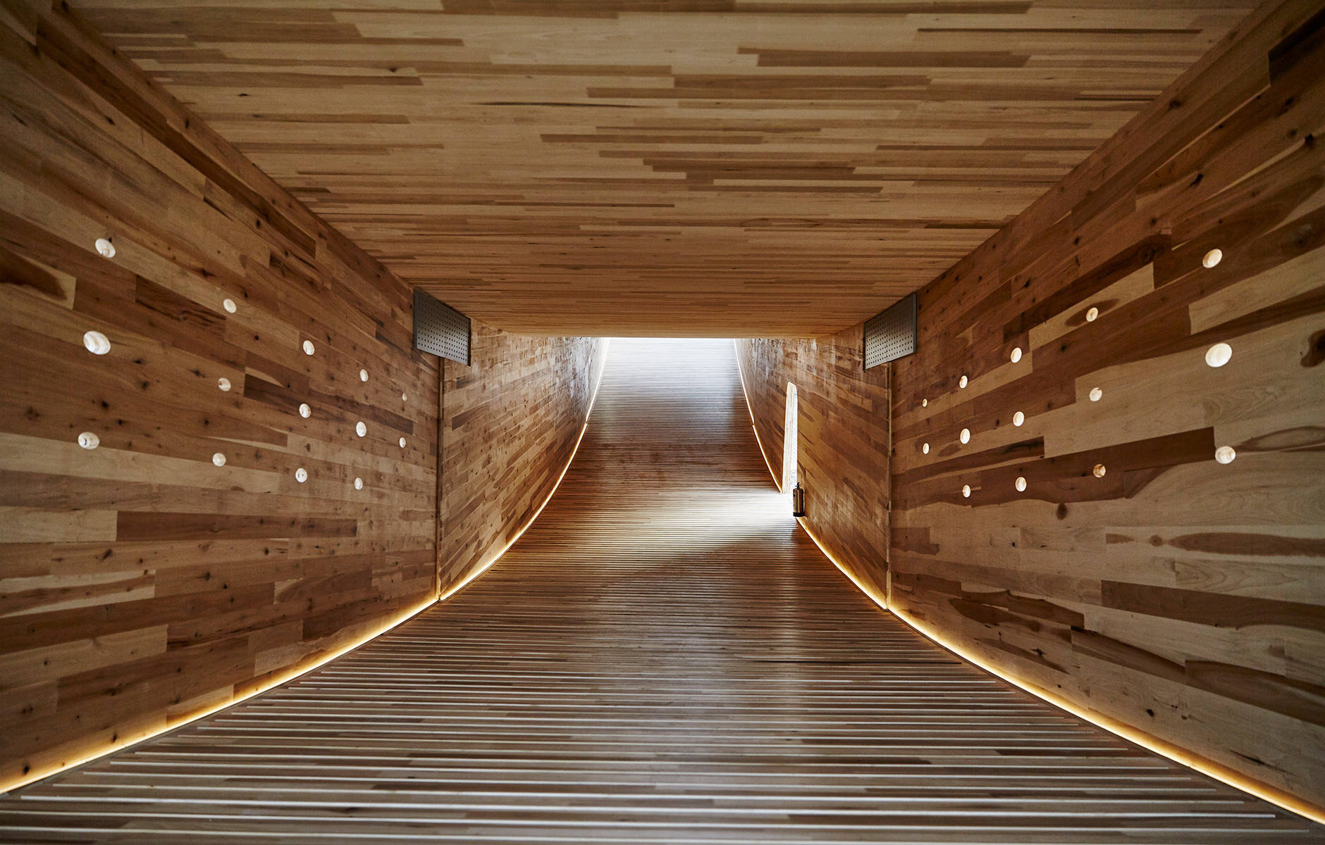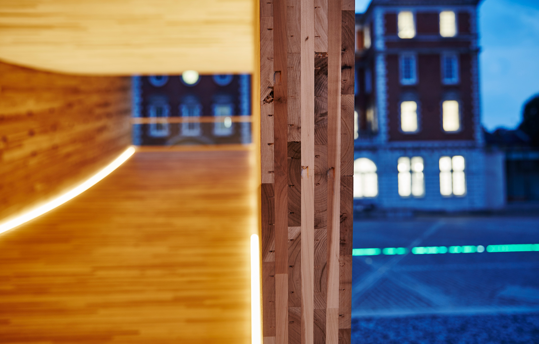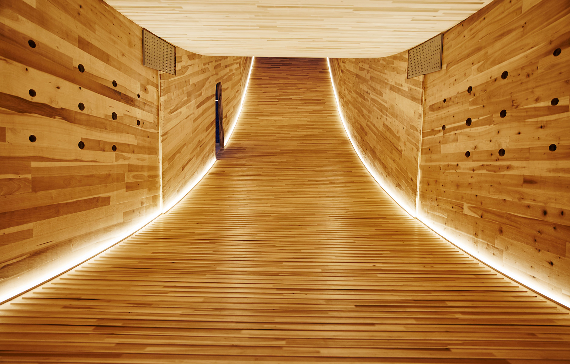 Light enters through the open ends, along with a number of holes in the sides. The holes are positioned where the wooden panels are under the least stress. In the centre the structure is anchored to a wooden wall that in turn is held in place by a concrete slab – but the curving ends are held up entirely by the strength of the crosslam.«
