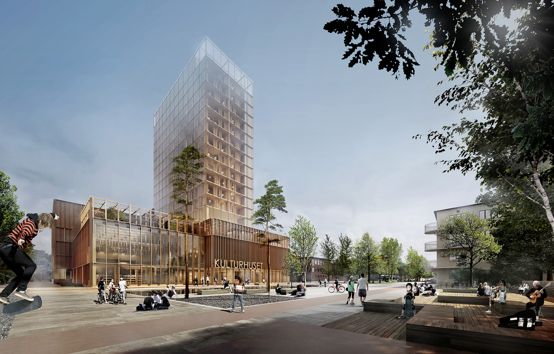 “THE BUILDING BOLDLY shows its local roots through its wooden character, with the wood giving the building a distinct identity.” This is how the jury for the architectural competition to design Skellefteå’s new cultural centre describes the winning entry, Sida vid sida by White Arkitekter. The building will house a library, theatre, art gallery, general meeting places and a hotel. Around 15 practices entered the competition, with the winning entry making use of glulam beams for its load-bearing structure. The other dominant feature of the building is the large expanses of glass, which make the wooden frame visible from all sides.