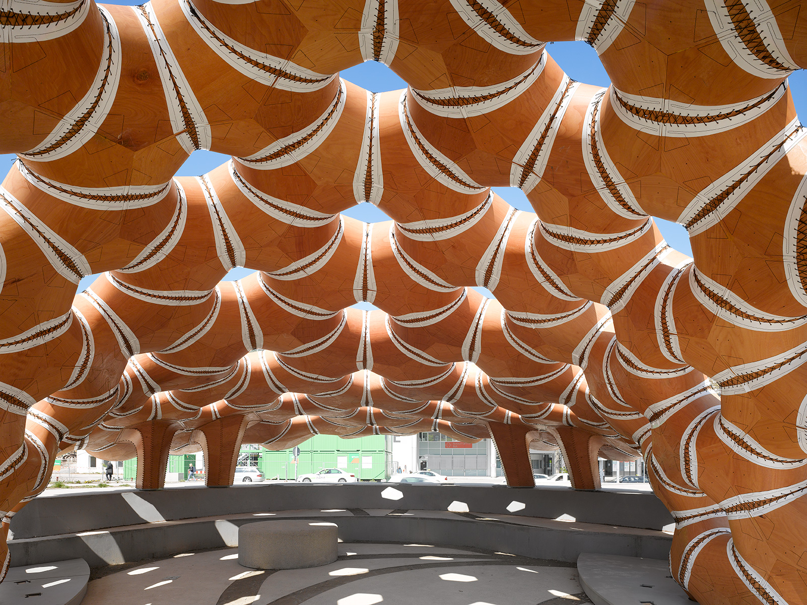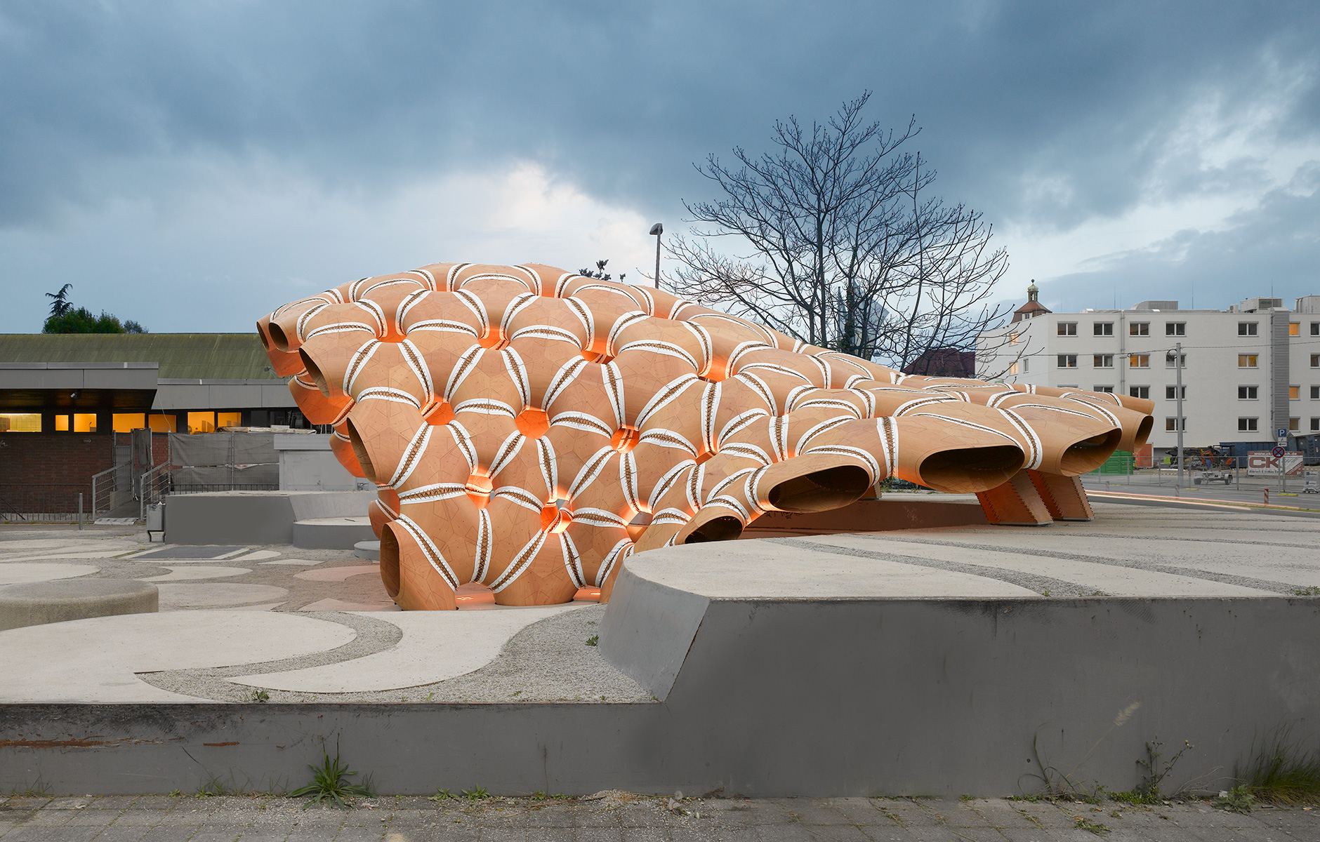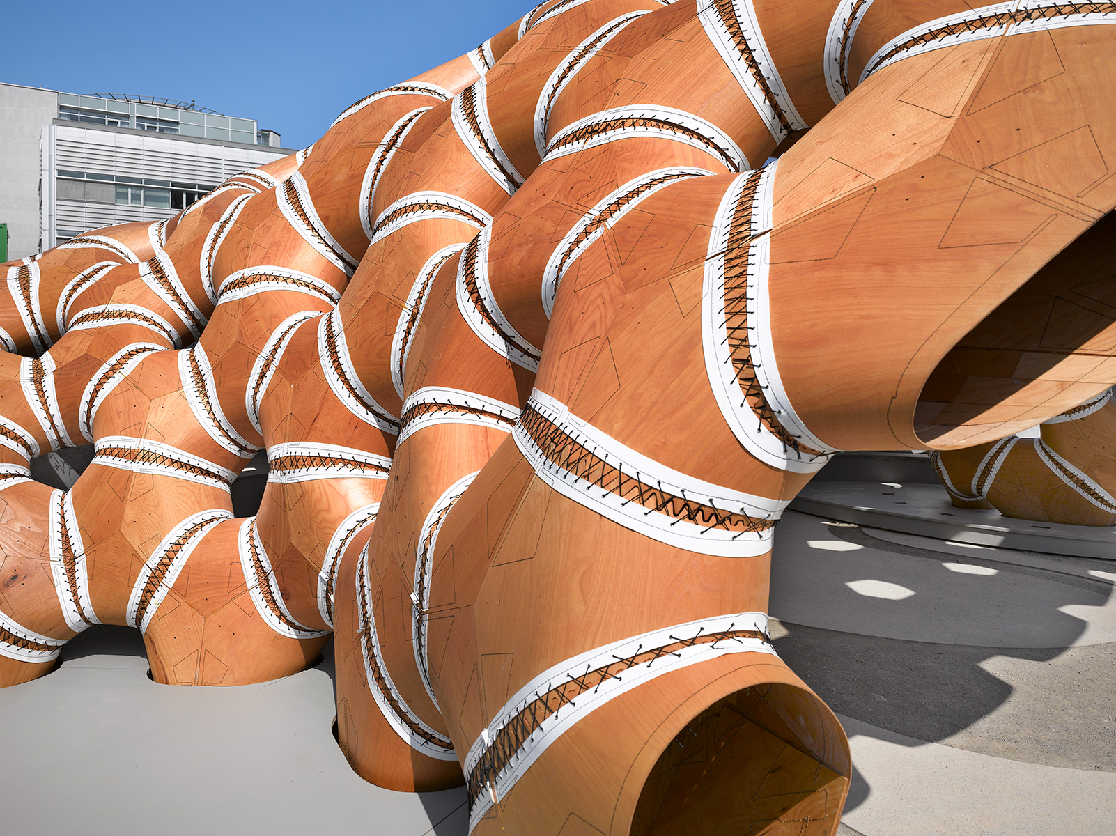 The pavilion comprises individually designed units made from thin beech plywood that has been cut to shape by robots. Instead of laminating the beech sheets with glue, they are fixed in their curved form by being sewn together using a robot-controlled sewing machine.«
