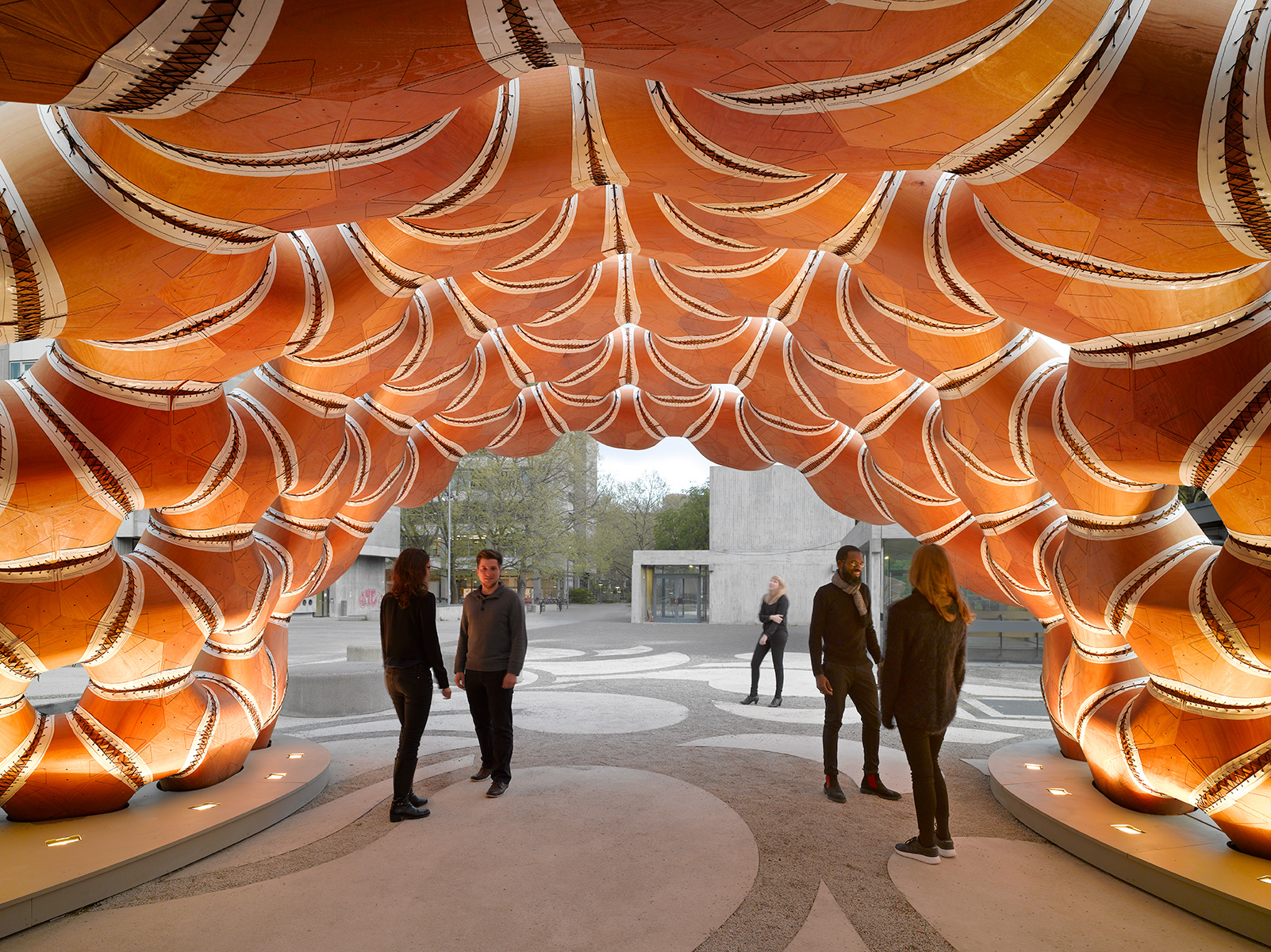 CLYPEASTEROIDA IS A family of flattened, burrowing sea urchins with short spines and a shell made up of small, curved calcium plates connected by fibres and finger joints. This complex structure has been subjected to close scrutiny by researchers and students at the University of Stuttgart. In a research pavilion on the campus, the joining techniques of the textile world have been combined with advanced plywood lamination based on studies of both clypeasteroida and sea cucumbers.