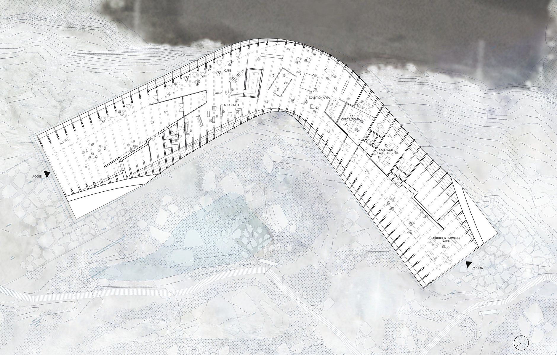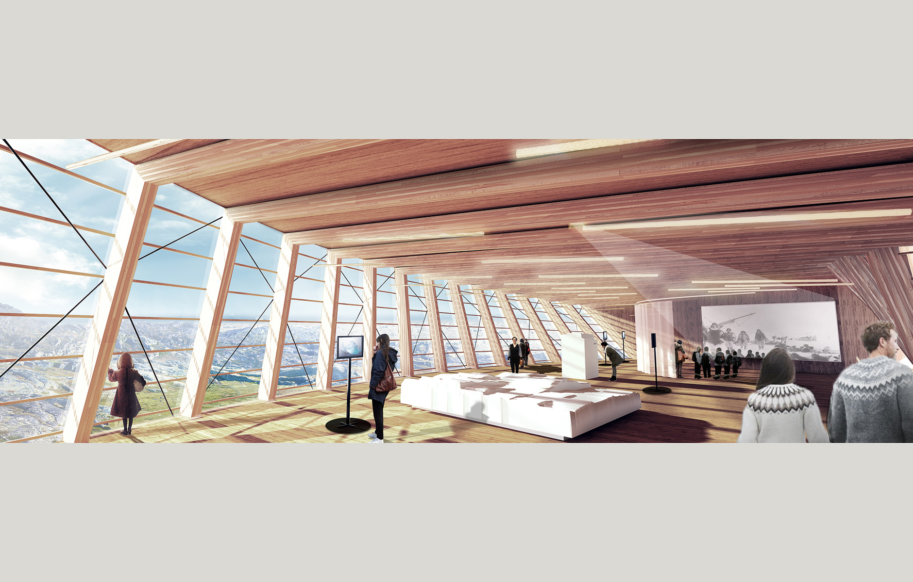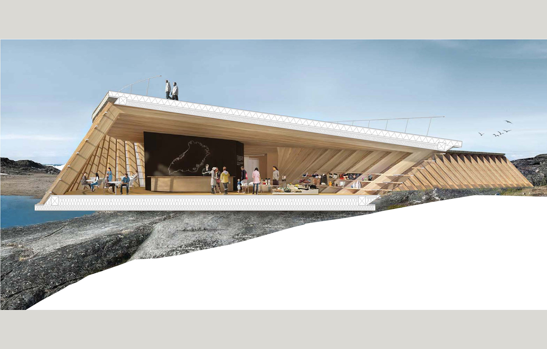 The fjord landscape of Ilulissat is one of Greenland’s biggest tourist attractions and a UN World Heritage site. A new visitor centre is intended to stimulate tourism and make it easier for people to experience the spectacular but not readily accessible natural scenery where the Sermeq Kullajek glacier runs out into the sea. The winding roof of the narrow building slopes towards the ground and marks the start of a walking trail that leads visitors out into the World Heritage site. But it also offers a raised platform for those who want to take in the natural beauty there and then. Under the roof there will be an exhibition all about the unique environment. The design is by Danish architectural firm Dorte Mandrup. The building currently only exists as a digital rendering as yet, so the practice is remaining tight-lipped about the structure of the building at the moment. They also don’t want to say which wood they intend to use. The building will be completed in 2020 and is expected to receive 25,000 visitors per year.